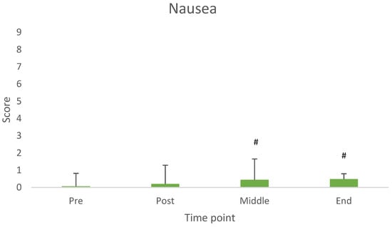 Values of nausea across measurement time points. # Difference from baseline (pre consumption) (p < 0.05).