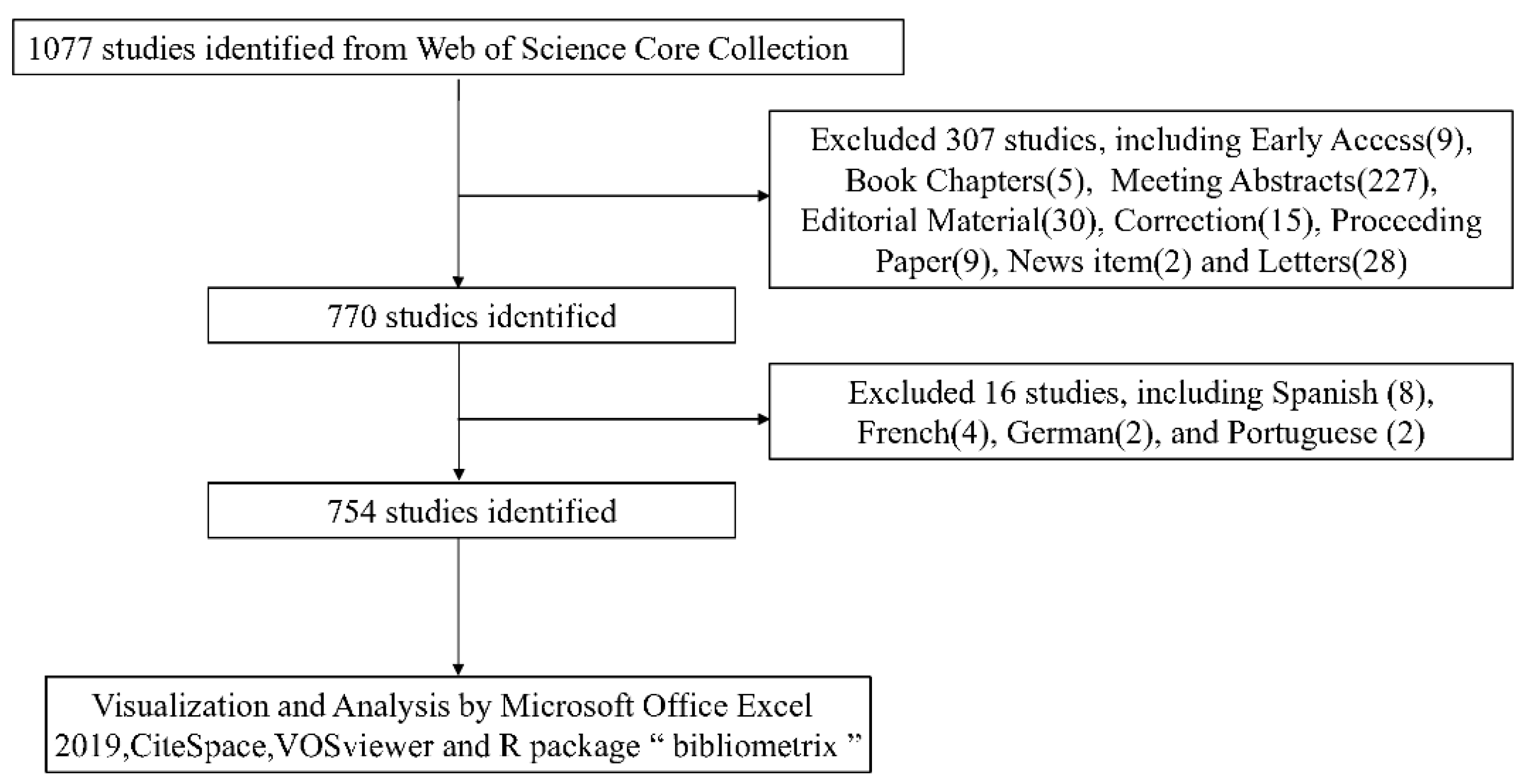 The systematic literature search conducted in January 2025 initially identified 1077 publication records from the Web of Science Core Collection (WoSCC). The screening and selection process, detailed in the flowchart (Figure 1), was as follows: after removing 307 records of non-relevant document types (e.g., Early Access articles, Book Chapters, Meeting Abstracts) and 16 non-English publications, a total of 754 publications were included for the subsequent bibliometric analysis.