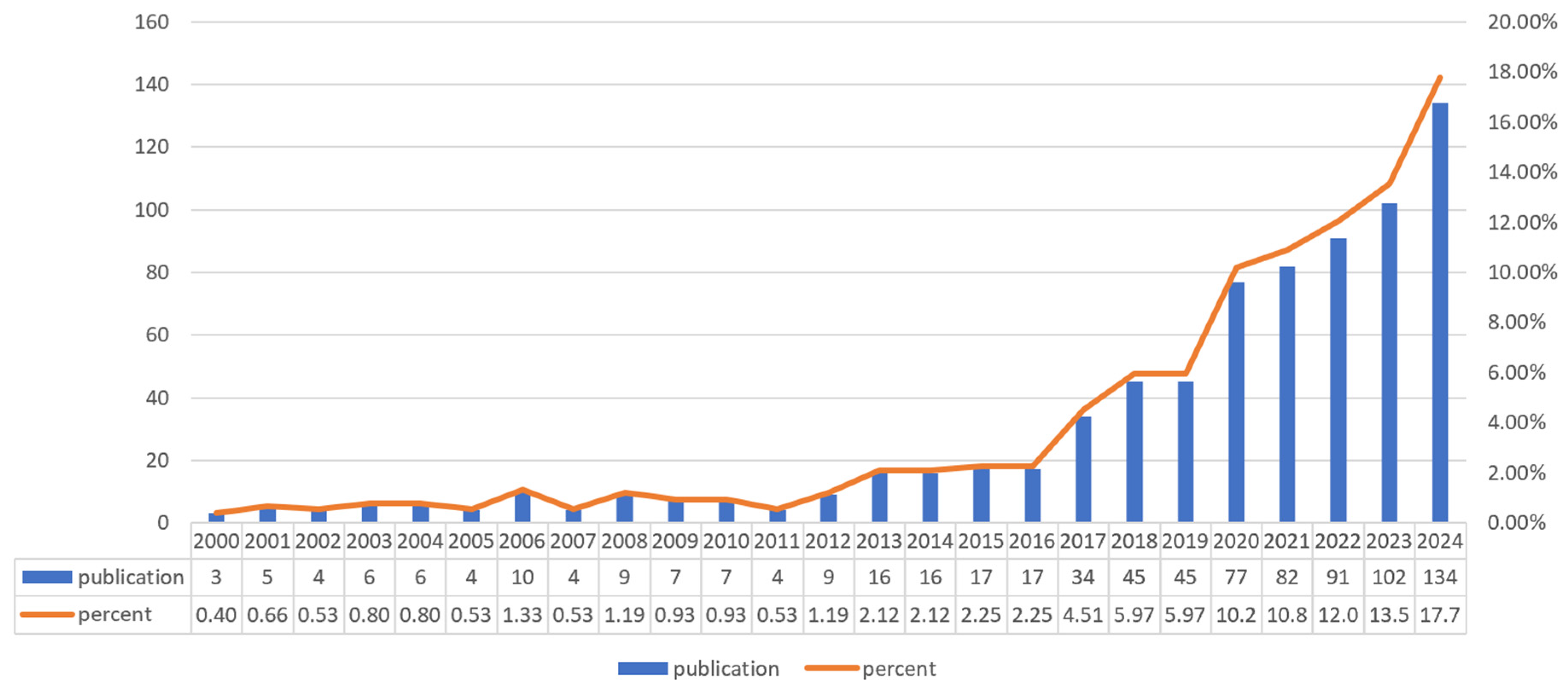 Figure 2. Number of publications in each period. Annual publication counts (blue bars) and their percentage of total publications (orange line) from 2000 to 2024. The left y-axis shows publication numbers, and the right y-axis shows the percentage of total publications.