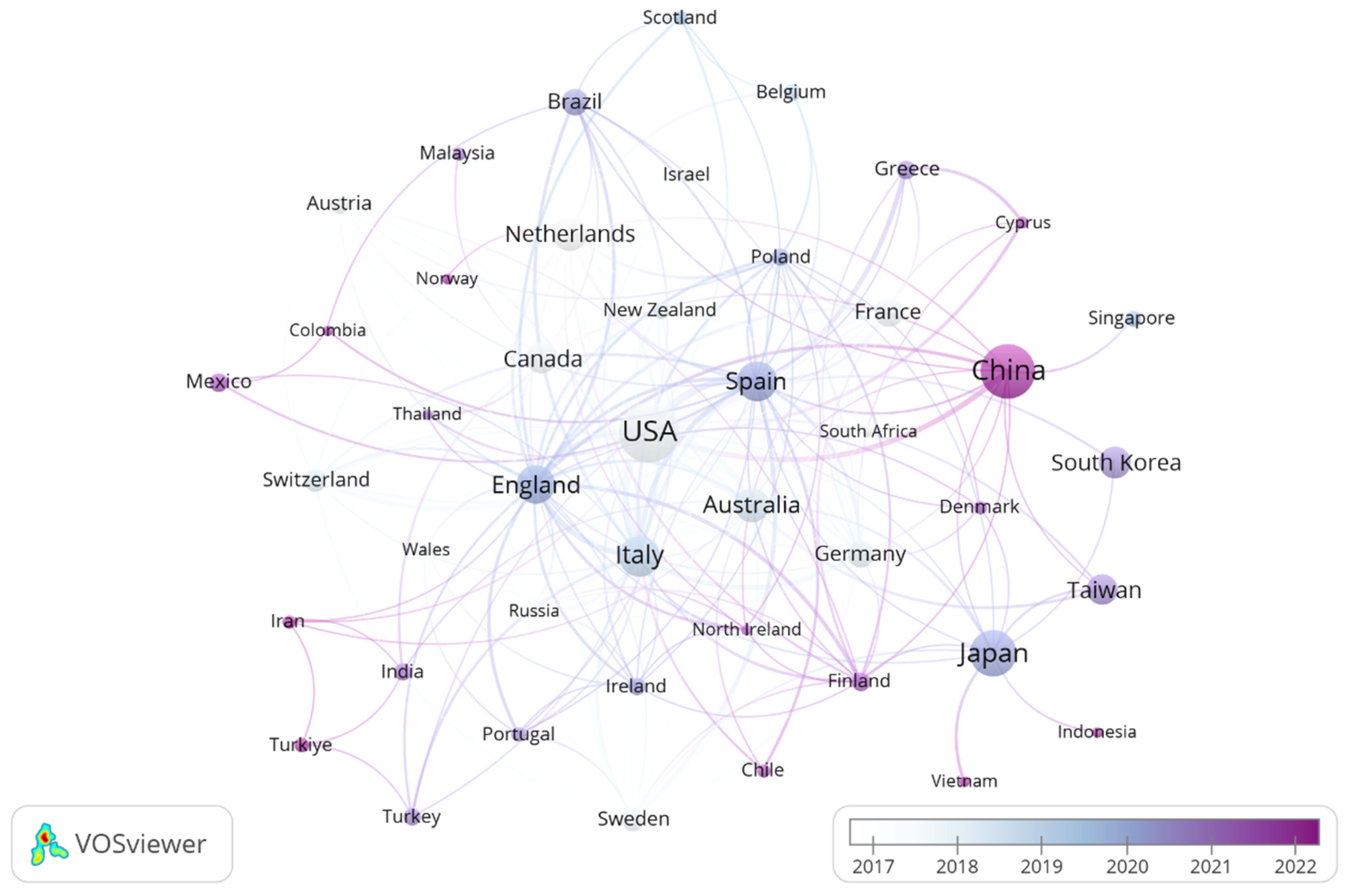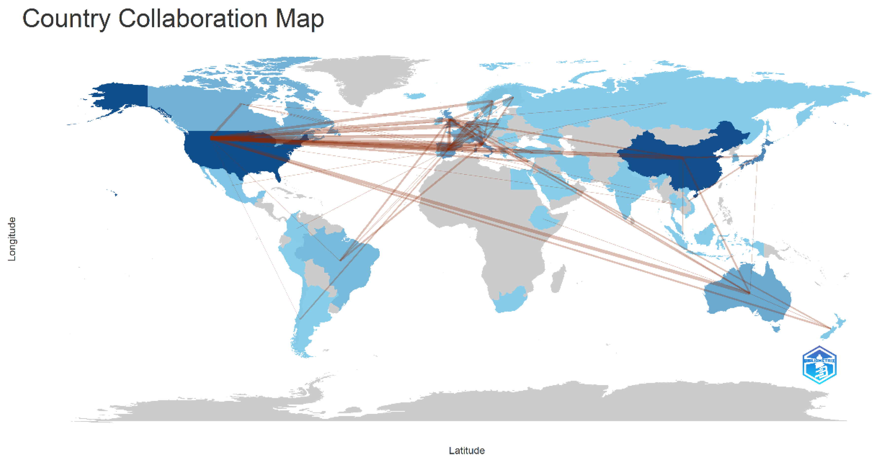 Figure 3. Country collaboration map. Note: The blue nodes represent countries, with the color depth proportional to the publication count of each country. The brown lines indicate collaborative relationships between countries, with thicker lines representing stronger or more frequent cooperation.