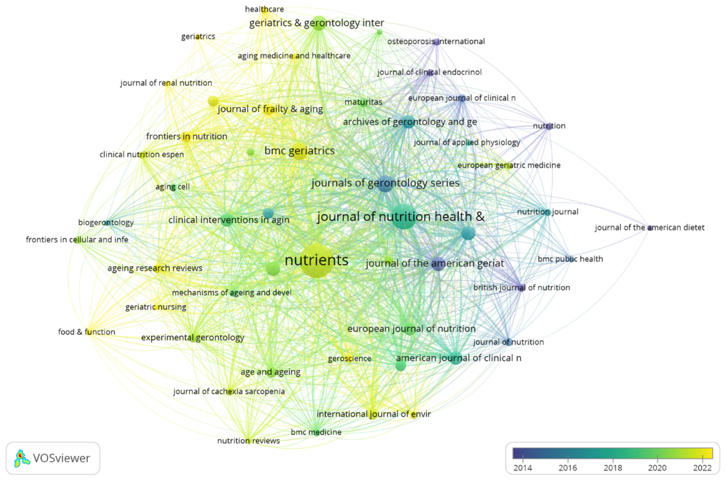 Research on nutrition and frailty has been disseminated across 268 journals, The top 15 journals with the highest publication volume are presented in Table 2, with Nutrients leading in publication volume (n = 89, 11.8%), followed by Journal of Nutrition Health and Aging (n = 52, 6.9%), and BMC Geriatrics (n = 23, 3.1%). Impact factor analysis identifies Journal of Cachexia Sarcopenia and Muscle (IF = 9.4) and BMC Medicine (IF = 7.1) as the highest-ranking journals in this field. Subsequently, we selected 52 journals based on the principle of having at least three publications and plotted the journal network. Figure 5 demonstrates that early-stage research (blue/purple nodes) primarily focused on nutritional aspects, represented by journals such as the Journal of the American Dietetics Association and Nutrition. Later research (green/yellow nodes) gradually expanded to encompass gerontology and clinical interventions, with frailty studies becoming prominently featured in journals including the Journal of Frailty and Aging, Clinical Nutrition, and BMC Geriatrics.