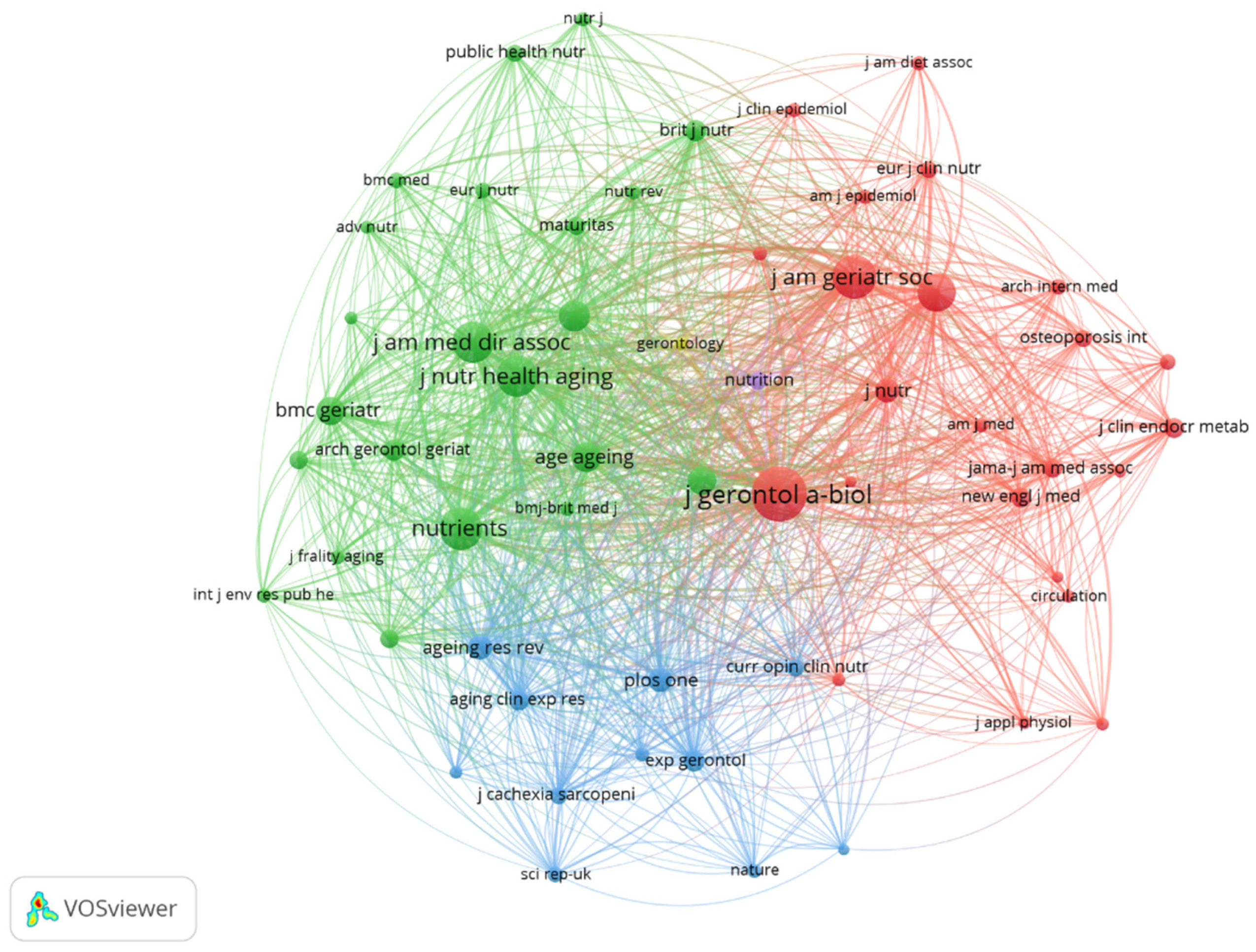 As indicated in Table 3, among the top 15 co-cited journals, 10 journals have been cited more than 1000 times. Citation analysis reveals the Journal of Gerontology Series A: Biological Sciences and Medical Sciences as the most frequently cited (2058 times), followed by the Journal of the American Geriatrics Society (1309 times), and Nutrients (1216 times). Notably, The Lancet (IF = 98.4) and The New England Journal of Medicine (IF = 96.3) emerge as the highest-impact journals in the co-citation network. Journals with a minimum of 100 co-citations were selected to construct the co-citation network, as illustrated in Figure 6, with Circulation showing significant co-citation relationships with Nutrients and Journals of Gerontology Series A: Biological Sciences and Medical Sciences. These findings highlight the interdisciplinary nature of nutrition and frailty research, bridging gerontology, clinical nutrition, and broader medical sciences.