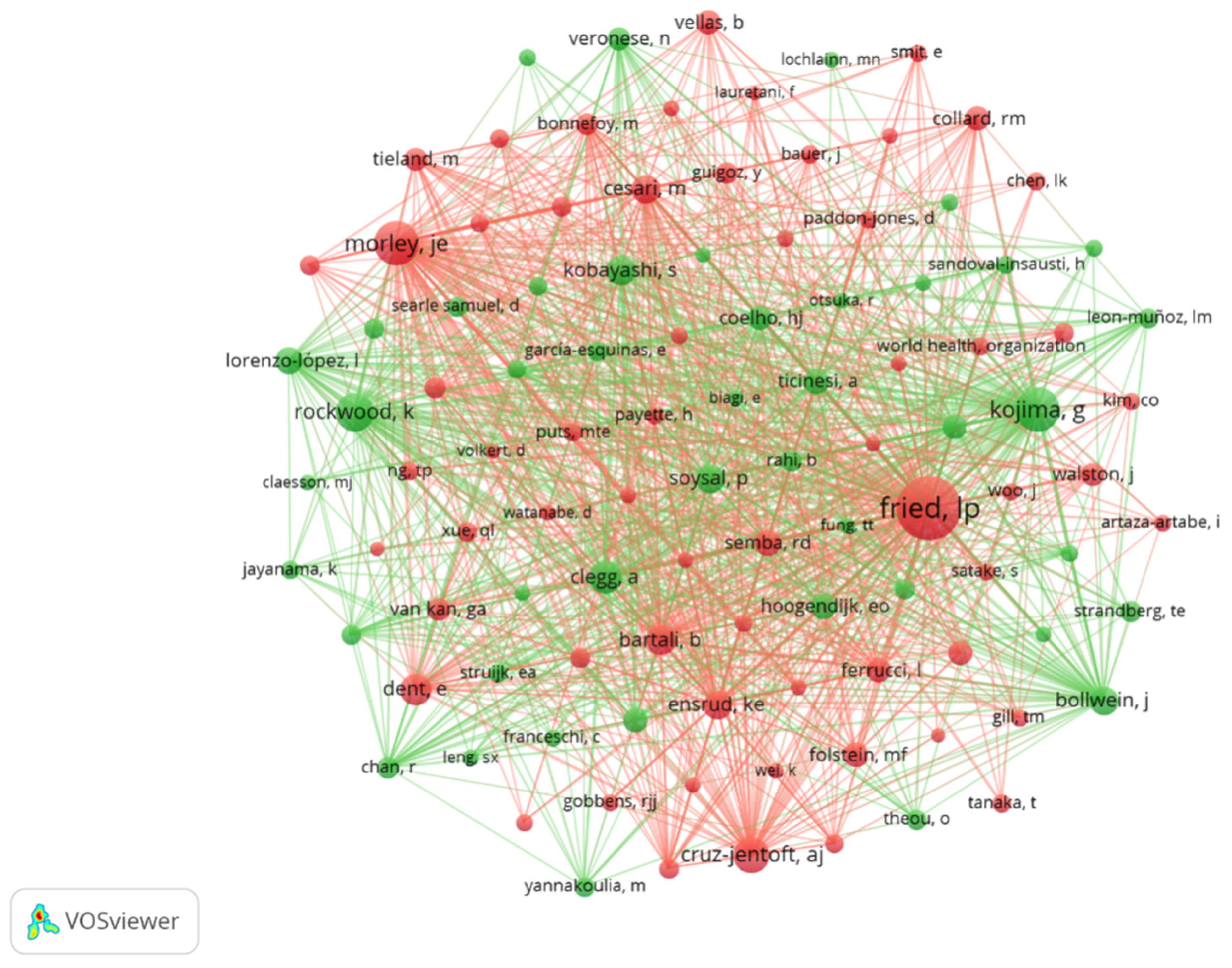 Among the 16,779 co-cited authors, 105 were cited more than 30 times, as detailed in Table 4. Three authors were cited over 200 times, with Linda P. Fried (n = 535) being the most frequently co-cited, followed by John E. Morley (n = 248) and Go Kojima (n = 245). Network visualization of 105 authors with ≥30 co-citations demonstrates (Figure 7) reveals active collaborative relationships, particularly between Marie Ní Lochlainn, Linda P. Fried, Emiel O. Hoogendijk, and Go Kojima. These findings highlight both the collaborative nature of the field and the central role of key researchers in shaping its intellectual landscape.