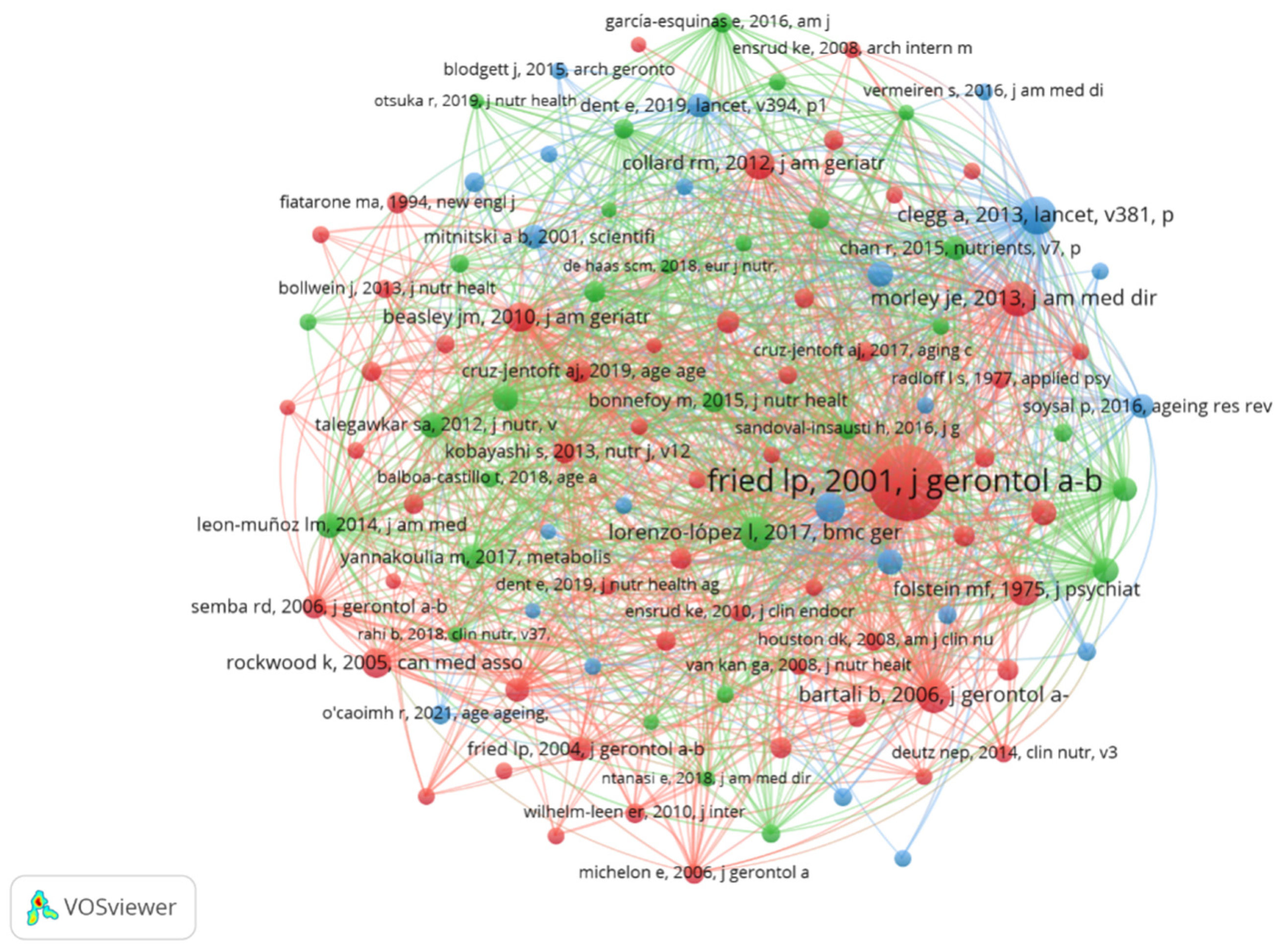 Figure 8. Co-citation network of references. Note: The central and most influential node (highlighted in red/largest size) corresponds to the foundational frailty phenotype paper by Fried et al. [4].