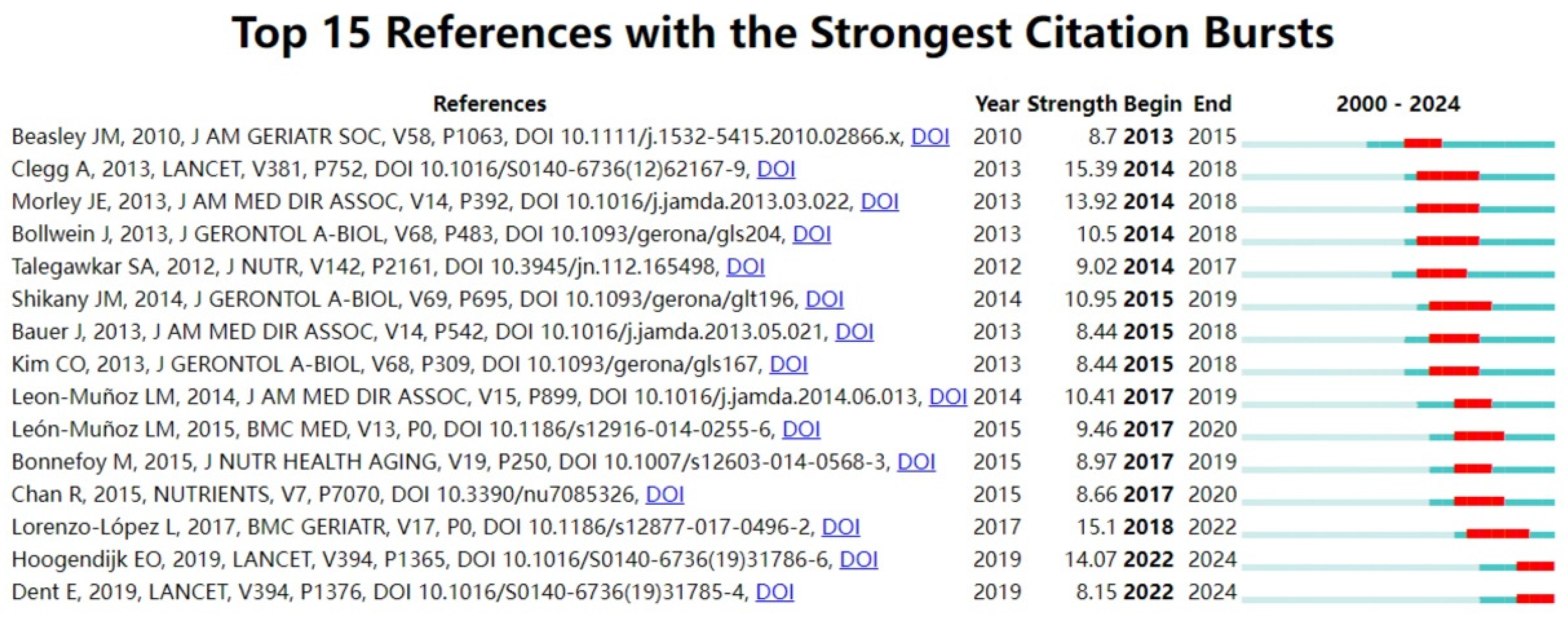 The citation burst literature refers to publications that are frequently cited by scholars in a specific field over a certain period. Using CiteSpace, we identified 15 highly cited references with significant citation bursts, as illustrated in Figure 9. The specific parameters configured for the citation burst analysis in CiteSpace are detailed in Section 2 (Section 2.3.1). The most impactful work, Clegg et al.’ 2013 Lancet article “Frailty in elderly people” (burst strength = 15.39, 2014–2018), established a seminal conceptual framework for frailty assessment. Lorenzo–López et al.’ 2017 BMC Geriatrics review “Nutritional determinants of frailty in older adults: A systematic review” (strength = 15.1) emerged as the second most influential, catalyzing research on dietary interventions. These high-impact publications (burst strengths: 8.15–15.39) collectively shaped key research directions, with burst durations (2–4 years) reflecting concentrated periods of intellectual engagement. Temporally, the earliest bursts (2010–2012) focused on frailty definitions, while later peaks (2017–2019) emphasized nutritional biomarkers and intervention strategies. Table S2 below summarizes the main research content of these articles in chronological order. This pattern underscores the field’s evolution from theoretical foundations to applied nutritional epidemiology, with sustained interest in mechanistic and translational research.