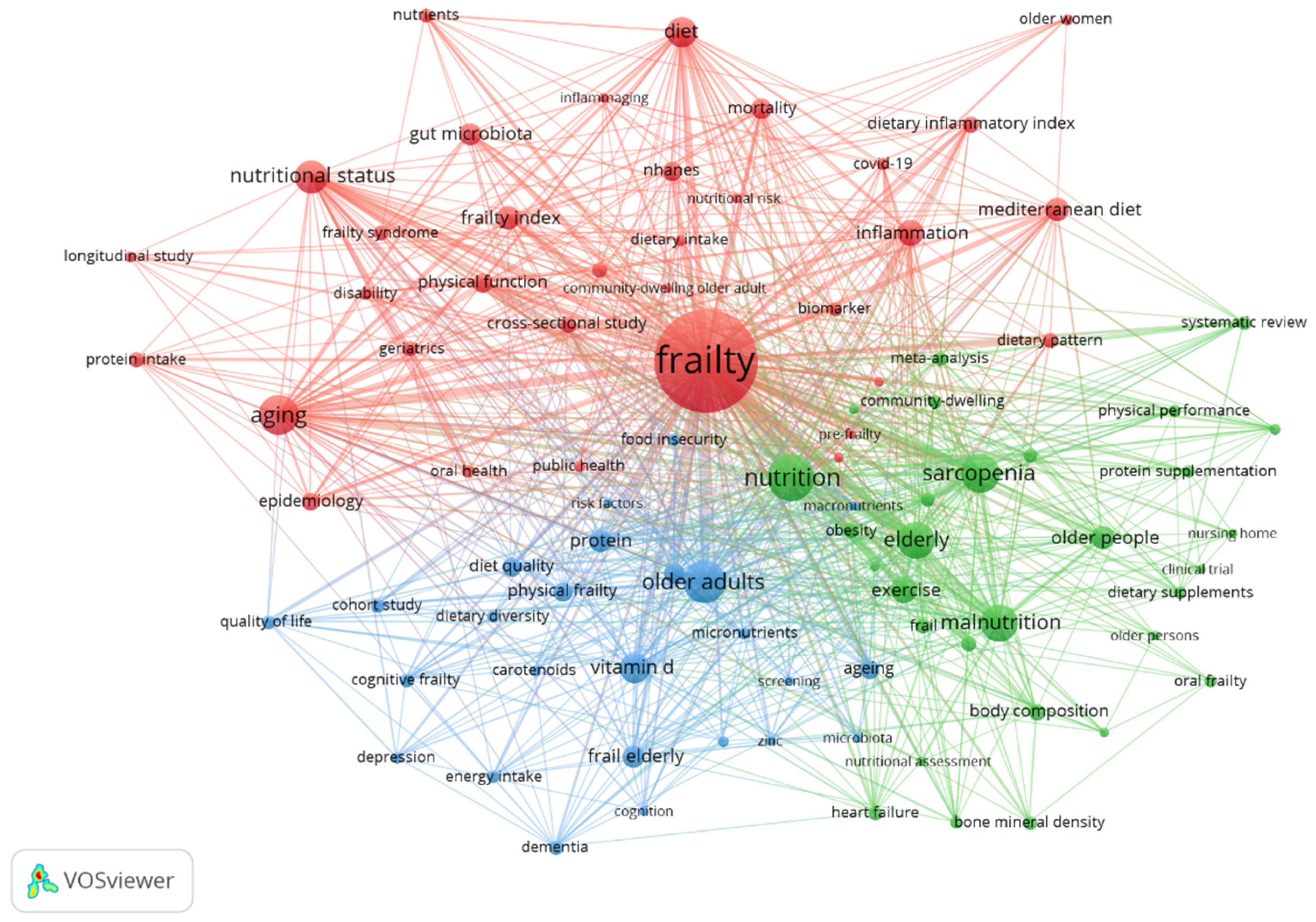 Keyword co-occurrence analysis reveals three core research clusters (Figure 10): mechanistic and epidemiological investigations (red cluster), focused on sarcopenia (159 mentions), malnutrition (139), nutritional status (103) and vitamin D (85), Nutritional interventions (green cluster), emphasizing dietary strategies and clinical management, and comorbidity studies (blue cluster), exploring links between frailty and chronic diseases. Table S3 lists the top 20 high-frequency keywords in nutrition and frailty research.