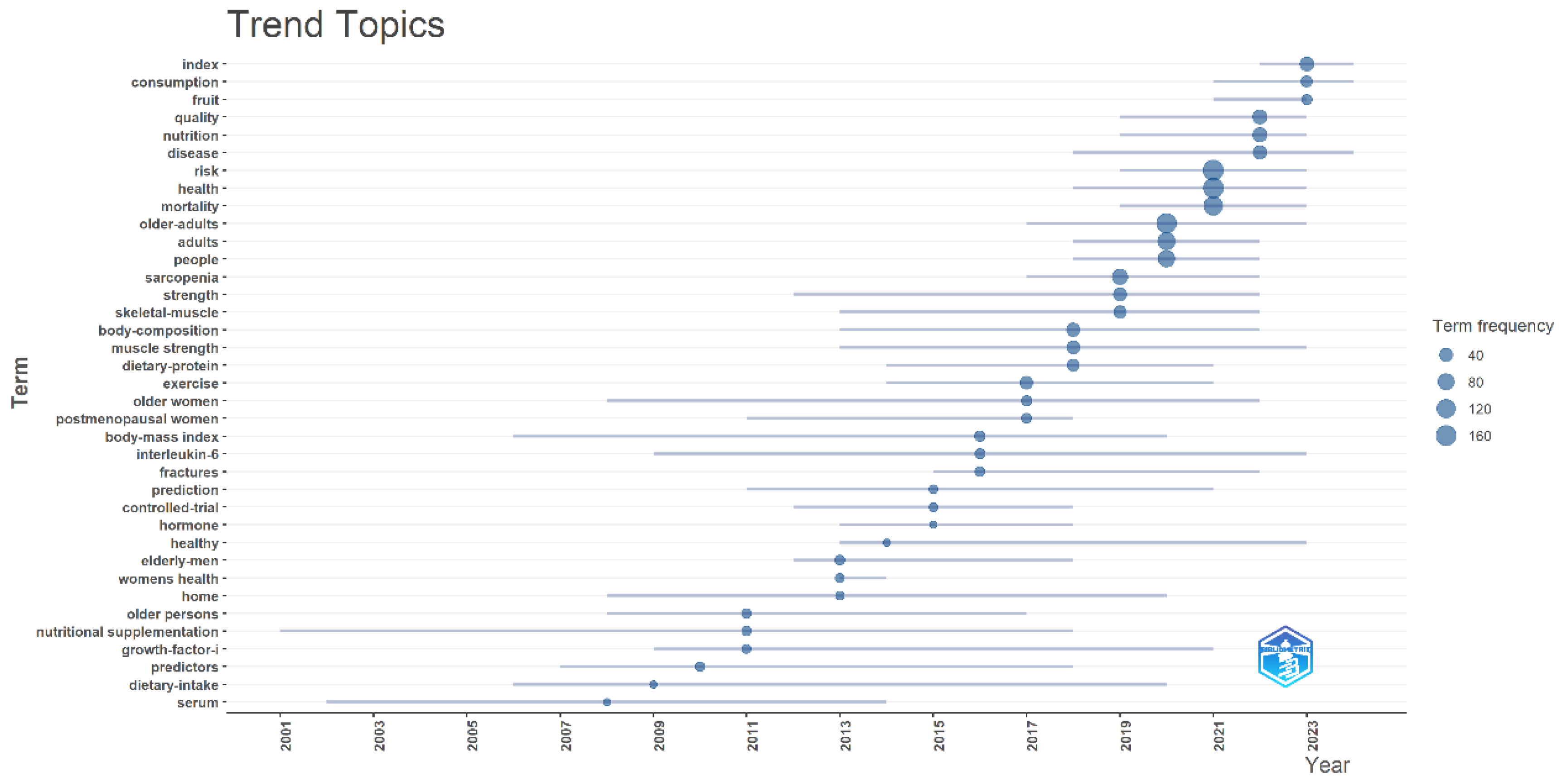 Temporally, trend research has evolved from early population-specific health concerns (e.g., older women, postmenopausal women) to current priorities in aging-related challenges, particularly muscle health and inflammatory biomarkers (e.g., interleukin-6). Emerging frontiers include predictive modeling of mortality risk and personalized intervention trials, reflecting a paradigm shift toward precision health management. Trend analysis demonstrates progressive refinement of focus areas: from broad frailty indicators (2000s) to functional assessments (2010s), and now to individualized therapeutic strategies (2020s). Recent keyword surges in “risk prediction”,” “clinical trials,” and “body composition” highlight growing emphasis on preventive approaches and mechanistic nutrition science (Figure 11). These patterns underscore the field’s maturation from descriptive.