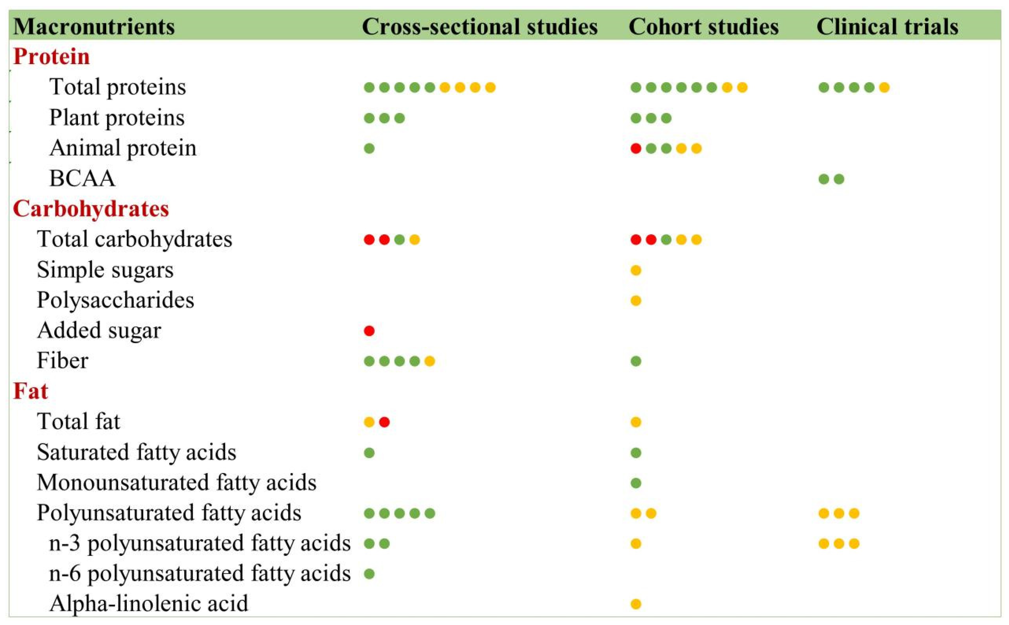 Figure 12. Macronutrients and frailty. Red circles indicate a positive association between the nutrient and frailty, signifying that the nutrient promotes frailty development. Yellow circles denote a neutral association. Green circles represent a negative association, indicating that the nutrient mitigates frailty progression.