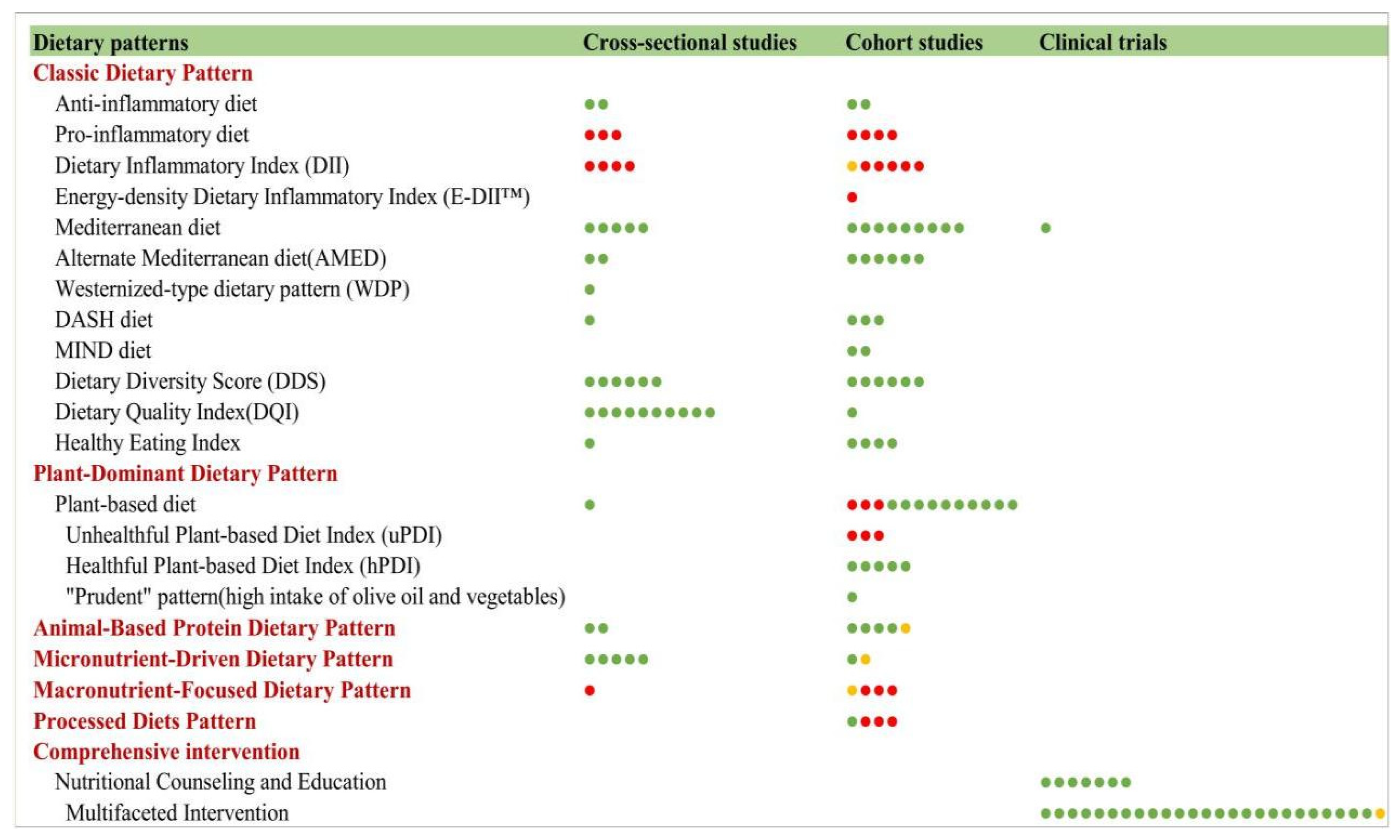 Figure 14. Food groups and frailty. Red circles indicate a positive association between the nutrient and frailty, signifying that the nutrient promotes frailty development. Yellow circles denote a neutral association. Green circles represent a negative association, indicating that the nutrient mitigates frailty progression.