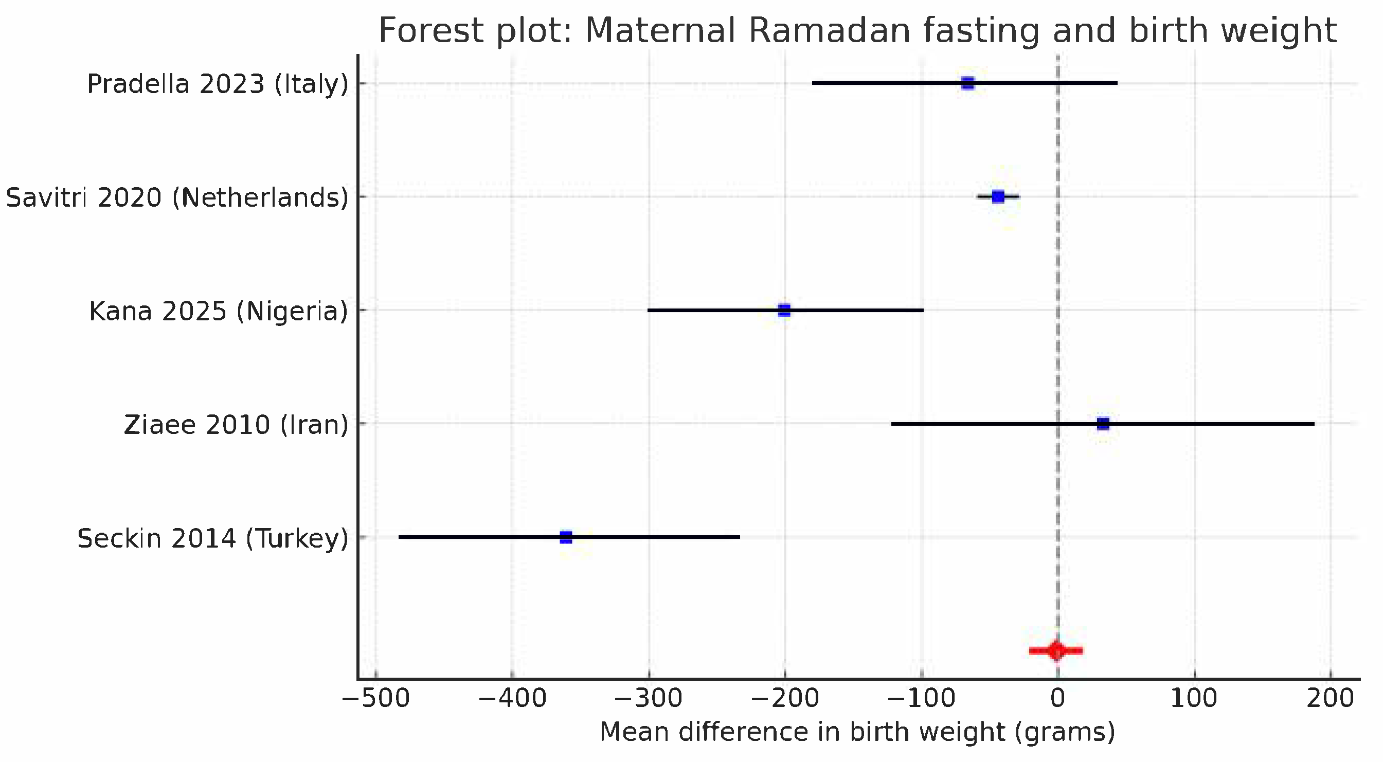 | Kana (2025) [10] | Observational study | Nigeria | 400 | 2nd–3rd | Nutrition and neonates | Birth weight influenced by post-fasting diet quality |