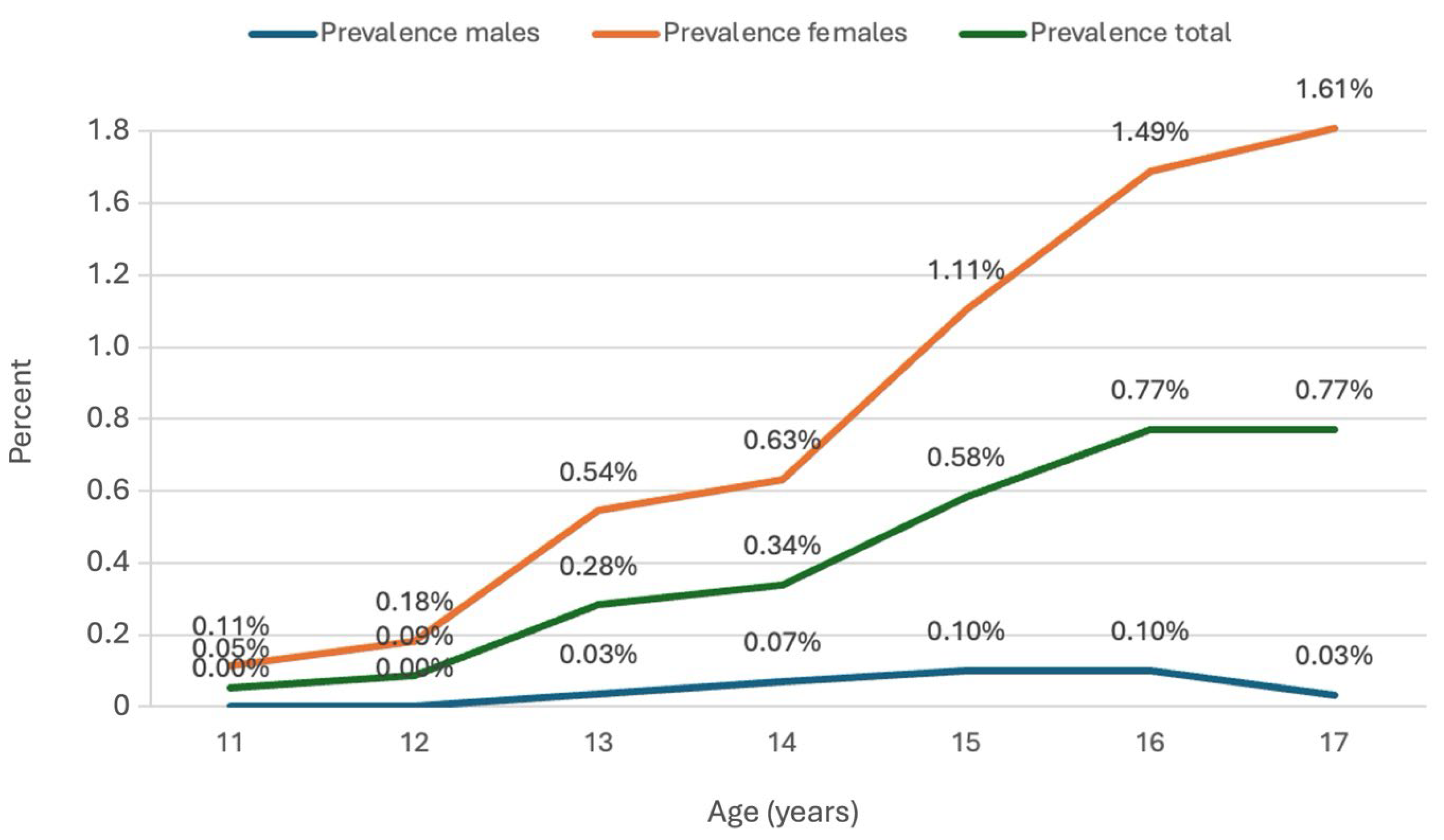Figure 1. Line graph showing the age-specific prevalence of clinically diagnosed eating disorders (ICD-10 codes F50.0–F50.9) among male and female adolescents aged 11–17 years in South Tyrol (2024).