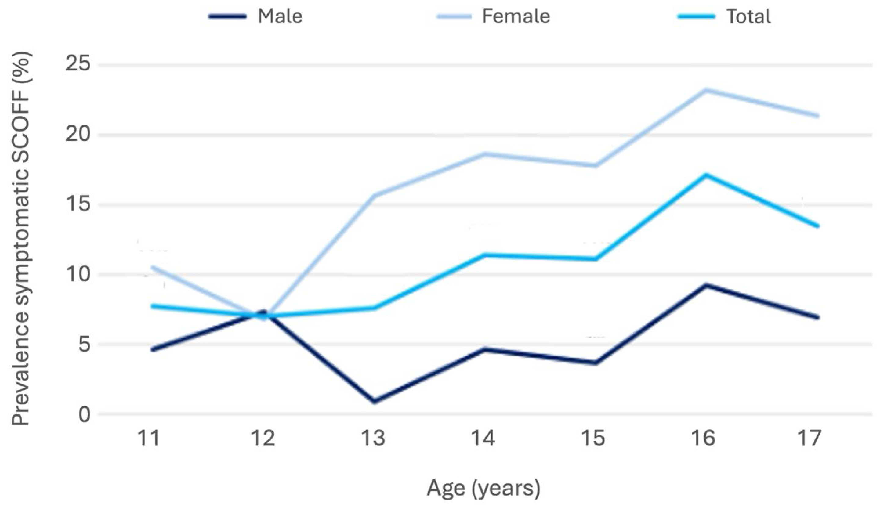 The overall prevalence of symptomatic SCOFF was 10.6% [9.1%; 12.3%] (self-reports, ages 11–17), with clear gender differences: 5.2% [3.7%; 7.0%] in boys and 16.2% [13.6%; 19.1%] in girls. As shown in Figure 3, prevalence increased significantly with age in females but remained relatively stable in males.