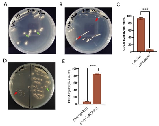 Identification of hydrolase activity of wild type and mutant strains. Bile salt agar precipitation halos assay of L. plantarum Lp20 wild type strain (A) and L. plantarum Lp20-Δbsh1 strain (B). (C) GDCA hydrolysis rate of L. plantarum Lp20 and its bsh1 mutant strain L. plantarum Lp20-Δbsh1. (D) Bsh1 complementation strain L. plantarum Lp20-Δbsh1+. (E) GDCA hydrolysis rate of bile salt in the L. plantarum Lp20-Δbsh1 and L. plantarum Lp20-Δbsh1+ strains complemented with pNZ11 (as control) and pNZbsh1 vector. Data are reported as the mean ± SEM from three independent experiments (*** p < 0.001). Red arrows denote the absence of bile salt agar precipitation halos; green arrows denote the presence of bile salt agar precipitation halos.