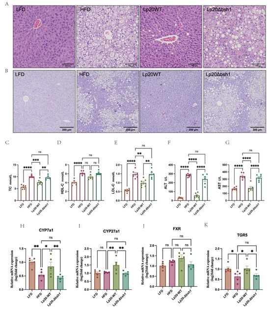 The impact of a HFD and L. plantarum Lp20 bile salt hydrolase on liver steatosis and serum bio-markers levels. H&E (A) and PAS (B) stained liver sections from LFD, HFD, Lp20-WT, and Lp20-Δbsh1 group. (C–E) represent serum TC, high-density lipoprotein cholesterol, and LDL-C, respectively. (F) Serum alanine aminotransferase. (G) Serum AST. Values are expressed as mean ± SEM (n = 6). (H–K) The mRNA expression of CYP7a1, CYP27a1, FXR, TGR5 in mice liver (n = 5). ns, no significant difference; * p < 0.05, ** p < 0.01, *** p < 0.001 and **** p < 0.0001 showed the significant difference with ANOVA analysis.