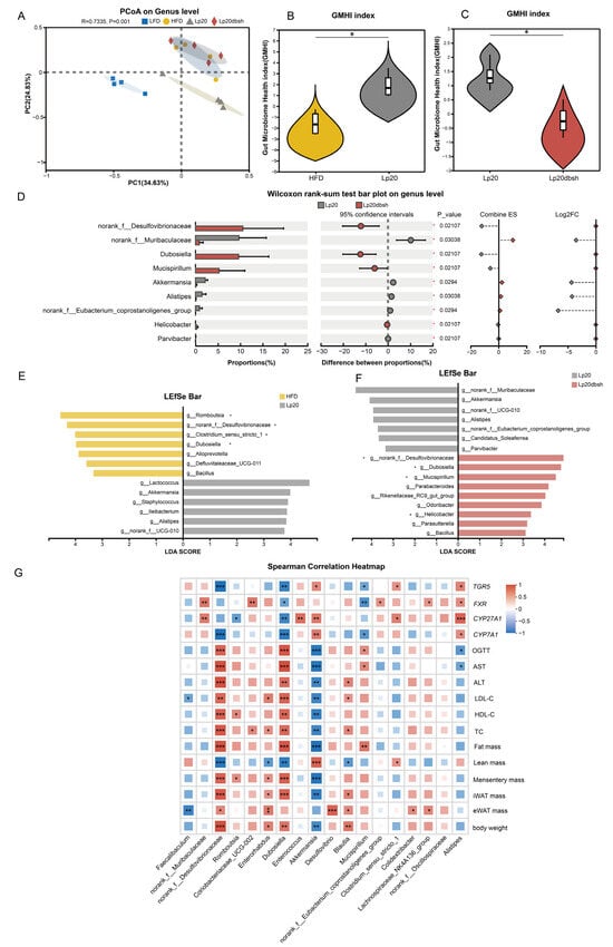 To systematically evaluate the therapeutic potential of Lp20-WT in reversing HFD-induced dysbiosis, we profiled faecal microbial communities by 16S rRNA gene sequencing. The analysis of the Shannon index revealed a significant increase in α-diversity within the Lp20-WT group relative to the LFD group (Figure S8). Moreover, when compared to the LFD group, the HFD group exhibited an augmented gut microbiota diversity, which may be associated with an increased fiber intake []. β-diversity principal-coordinate analysis (PCoA, Bray–Curtis distance) revealed complete segregation of LFD and HFD groups along PC1, indicating that HFD profoundly reshaped gut microbial architecture. Strikingly, Lp20-WT intervention steered the microbial community away from the HFD-associated configuration, indicating a partial restoration of both richness and composition, whereas the Lp20-Δbsh1 cohort remained indistinguishable from the HFD group (Figure 6A). Quantitation using the Microbiota Health Index (MHI) corroborated these findings: Lp20-WT fully restored HFD-lowered MHI scores (p < 0.05), whereas MHI values in the Lp20-Δbsh1 group remained indistinguishable from those of the HFD cohort (Figure 6B,C). Lp20-WT expanded beneficial SCFA producers—including norank_f__Muribaculaceae, Akkermansia, and Alistipes. At the same time, it suppressed LPS-producing pro-inflammatory taxa such as norank_f__Desulfovibrionaceae, Dubosiella, and Mucispirillum (Figure 6D). LEfSe with LDA score > 3.0 further disclosed that the HFD microbiota was dominated by potential pathogens (g__Romboutsia, g__norank_f__Desulfovibrionaceae, and g__Dubosiella). In contrast, Lp20-WT fostered a beneficial consortium centered on Akkermansia and Alistipes, whereas Lp20-Δbsh1-treated mice retained a pro-inflammatory signature enriched for g__norank_f__Desulfovibrionaceae, g__Dubosiella, and g__Mucispirillum (Figure 6E,F), reinforcing that loss of BSH activity attenuates probiotic efficacy. Furthermore, we analyzed the correlation between bacterial abundance and host phenotypes (Figure 6G). The relative abundance of fecal Akkermansia was significantly negatively correlated with white adipose tissue mass and serum levels of TC, ALT and AST, but positively correlated with lean mass and the hepatic expression of BA synthesis rate-limiting enzymes CYP7A1 and CYP27A1, as well as nuclear receptors FXR and TGR5. In contrast, the abundance of norank_f__Desulfovibrionaceae and Dubosiella was positively associated with metabolic inflammatory phenotypes. These results collectively demonstrate that Lp20-WT improves gut microbial balance through BSH-dependent metabolic regulation, thereby restoring host metabolic homeostasis.