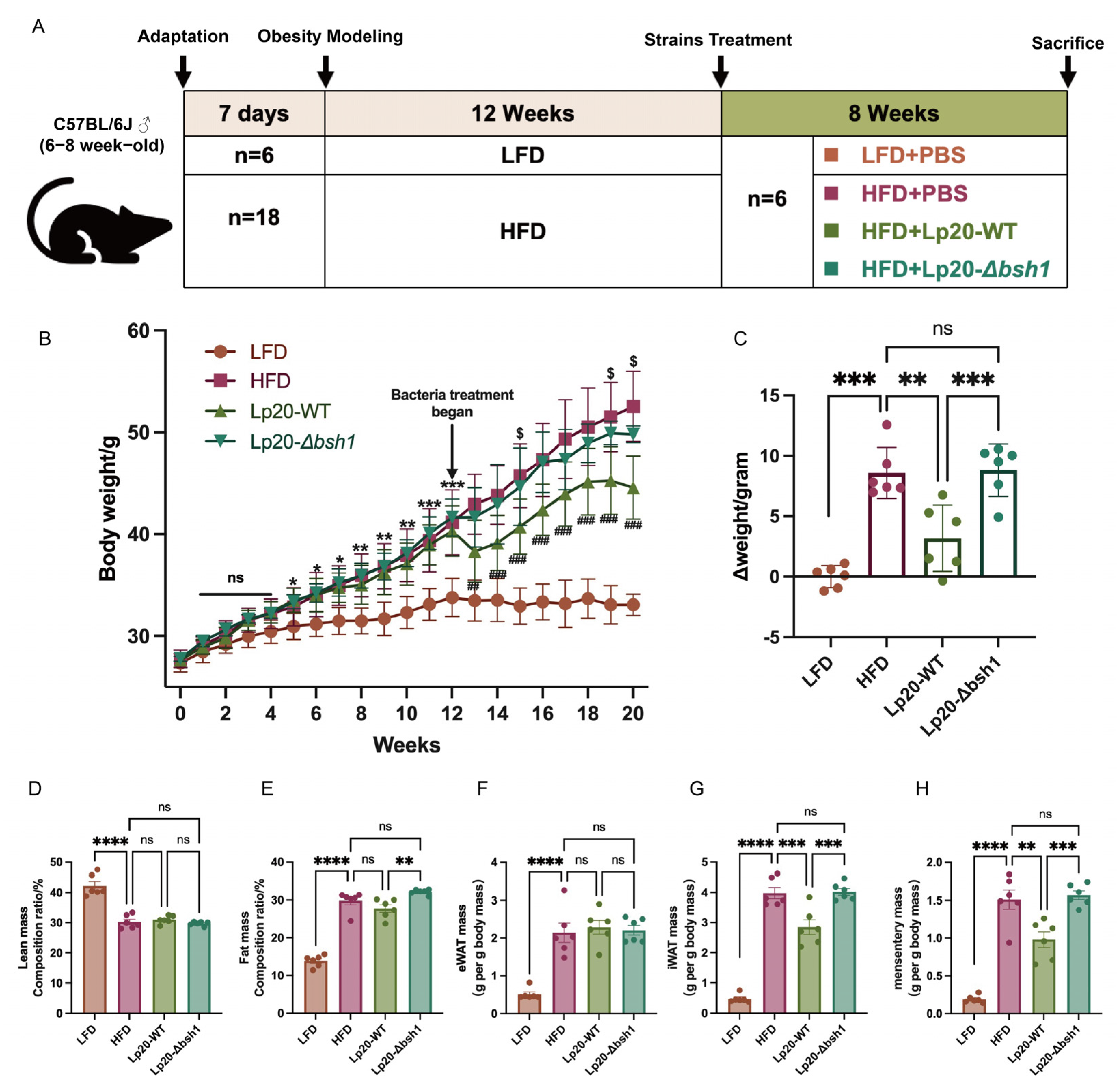Bai, X.; Lu, F.; Jing, Y.; Wang, H.; Qian, H.; Zhang, M.; Zhai, Z.; Hao, Y. Lactiplantibacillus plantarum Lp20 Alleviates High Fat Diet-Induced Obesity in Mice via Its Bile Salt Hydrolase Activity. Nutrients 2025, 17, 3555. https://doi.org/10.3390/nu17223555