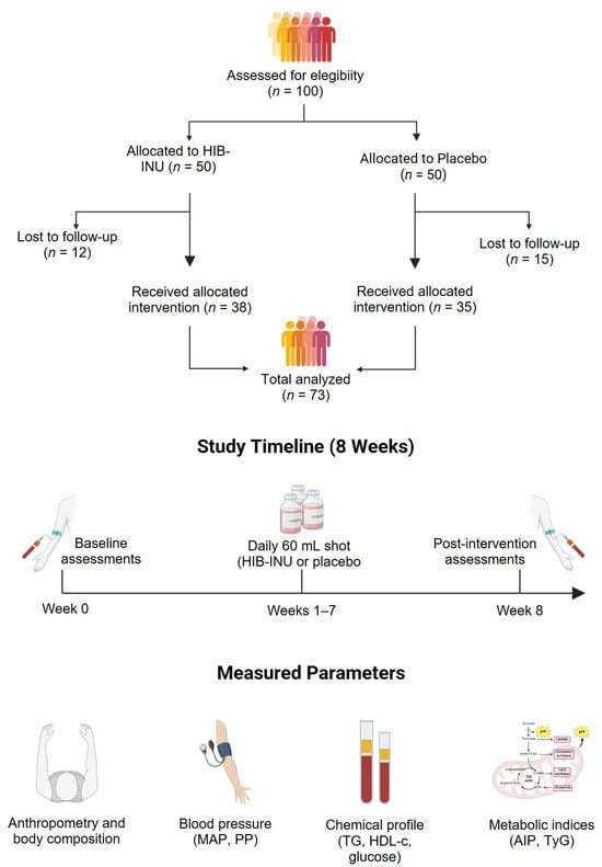 A total of 100 participants were screened for eligibility and randomly assigned in a 1:1 ratio to the intervention (HIB–INU) or placebo groups (n = 50 per group). Stratified randomization was used by sex, age, and BMI to ensure comparability between groups []. The randomization sequence was computer-generated and managed by a researcher independent of data collection and analysis to prevent selection bias. Both beverages were distributed in identical, coded containers that were indistinguishable in terms of color, taste, and appearance. Participants, clinical staff, and data analysts remained blinded until database lock, and allocation concealment was preserved throughout the trial.