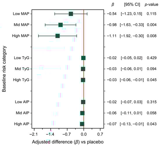 A stratified analysis was conducted to determine whether baseline cardiometabolic status influenced the magnitude of treatment effects. Participants were categorized into low, medium, and high baseline tertiles for AIP, TyG, and MAP, and all comparisons were adjusted for age and sex to examine potential treatment-by-baseline interactions.