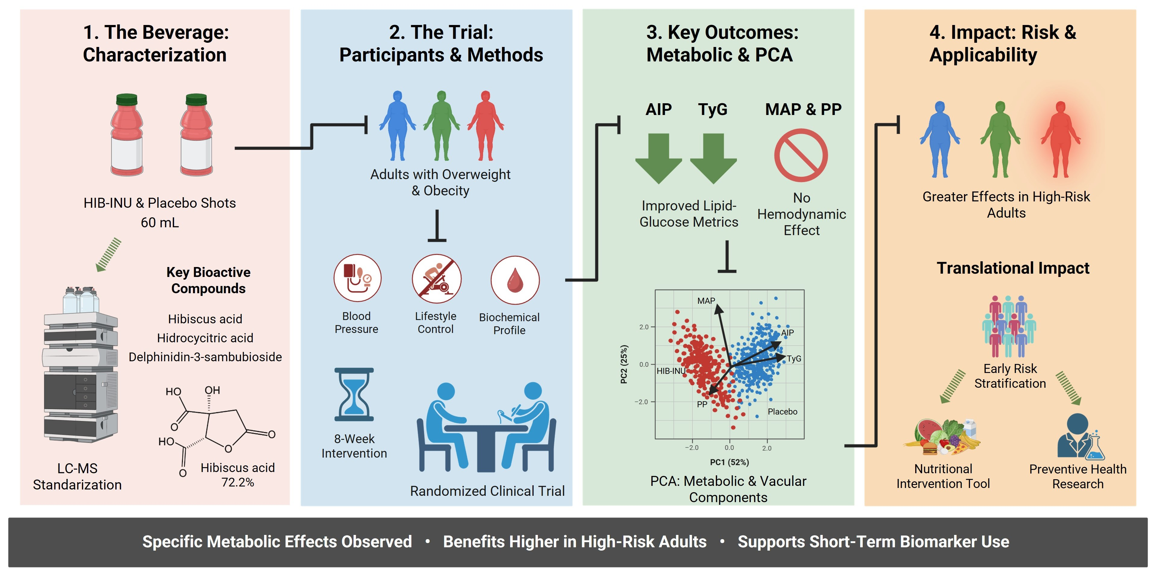 Mendivil, E.J.; Rivera-Iñiguez, I.; Arellano-Gómez, L.P.; Martínez-López, E.; Hernández-Guerrero, C.; Sayago-Ayerdi, S.G.; Tejeda-Miramontes, J.P. Standardized Hibiscus–Inulin Shot Lowers Lipid–Glucose Indices in Adults with Overweight and Obesity: 8-Week Randomized Trial. Nutrients 2025, 17, 3556. https://doi.org/10.3390/nu17223556