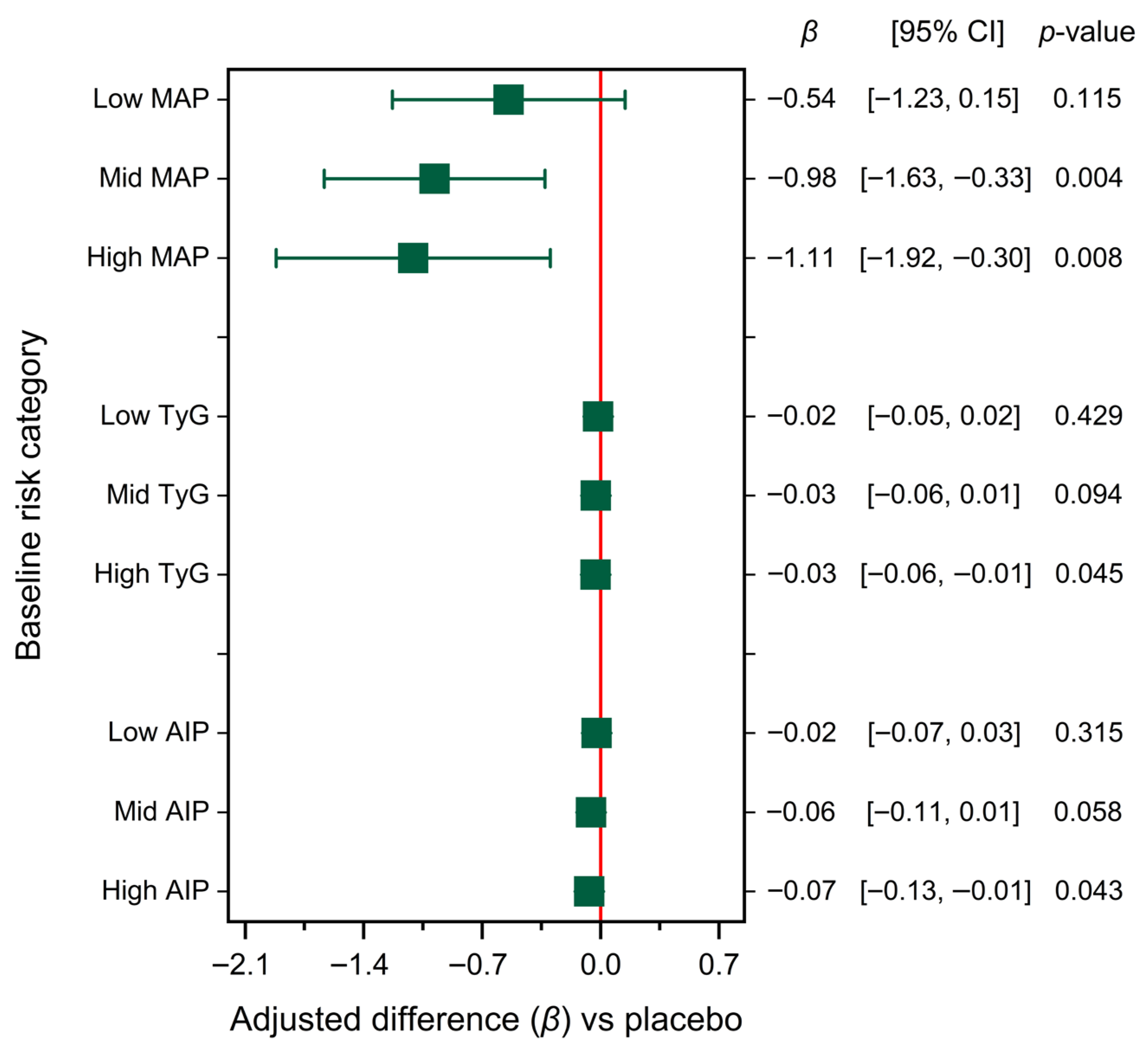 | TyG | Placebo | 8.41 ± 0.44 | 8.39 ± 0.42 | −0.016 | 0.049 |