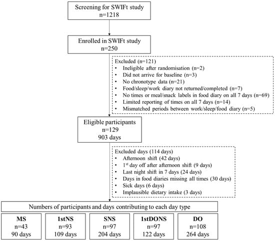 Figure 1 shows the participant flow chart of screening for and enrolment into the SWIFt study through to eligibility for this study. Of the participants enrolled in the SWIFt trial (n = 250), a proportion of food diaries were ineligible for inclusion in this study. This was due to many participants choosing to use the Research Food Diary App, which required timings to be typed in a separate note section rather than entered conveniently at the same time of food entry, leaving 129 individuals with eligible data specifically for this study. Strict definitions of eligible day types were applied, and completeness of meal timing data was required to ensure rigorous data analyses. There was no minimum cut-off of number of days of dietary data reported for inclusion in the analysis. Over 95% of participants provided dietary data for at least 4 days (Online Resource 1). In total, there were data for 90 MS, 109 1stNS, 204 SNS, 122 1stDONS, and 264 DO.