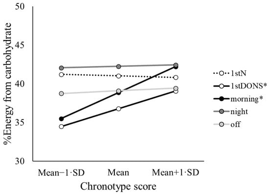 Shift type by chronotype interaction plot for %energy from carbohydrate. Values are estimated marginal means from the model evaluated at the mean value for chronotype plus or minus one standard deviation. MS: morning shift; SNS: subsequent night shift; 1stNS: 1st night shift; 1stDONS: 1st days off after night shift; DO: other days off. * p < 0.05 from simple effects test (slope is significantly different from zero).