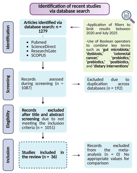 A comprehensive bibliographic search was performed in PubMed, ResearchGate, Scopus, and ScienceDirect to identify relevant literature published until July of 2025. Boolean operators were used to optimize the search, combining key terms such as “gut microbiota”, “dysbiosis”, “colorectal cancer”, “probiotics”, “prebiotics”, “postbiotics”, and “dietary interventions”. Additional filters were applied to exclude duplicate records across databases, non-relevant studies, and articles not published in open access format.