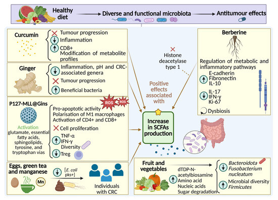 As previously described, it is well known that maintaining a healthy lifestyle, including a varied and balanced diet, can promote the maintenance of an optimal gut microbiota variety and functionality. In this context, recent studies have focused on examining the effects of specific dietary compounds that support microbiota modulation in various diseases, and specifically in CRC. Below, we detail the most relevant compounds that have been examined up to date.