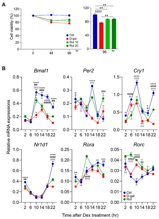 Rutin Regulates Circadian Core Clock Gene Oscillations Impaired by D-galactose-Induced Senescence in Differentiated C2C12 Cells. (A) MTT assay was performed using rutin at concentrations of 10 and 20 μM, depending on the experimental time points. One-way ANOVA with Tukey’s multiple comparisons. (B) Real-time quantitative PCR was performed to analyze the expression of core clock genes in C2C12 cells four days after differentiation. Data are shown as mean ± SEM every 4 h for 24 h after synchronizing the cells with Dex (n = 3/group/time point). *: Crtl vs. D-gal, #: D-gal vs. Rut, †: Ctrl vs. Rut. Two-way ANOVA with Tukey’s multiple comparisons. * p < 0.05, ** p < 0.01, *** p < 0.001, **** p < 0.0001, # p < 0.05, ## p < 0.01, ### p < 0.001, #### p < 0.0001, † p < 0.05, †† p < 0.01, ††† p < 0.001, †††† p < 0.0001.