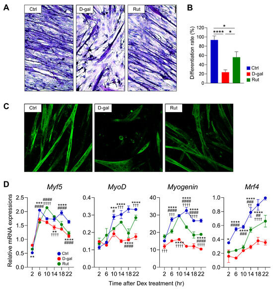 H&E staining was performed to assess the effect of D-gal–induced senescence on the myogenic differentiation ability of differentiated C2C12 cells after 5 days of differentiation. Myotube formation was significantly decreased in the D-gal group (23.8%) compared to the control (93.6%) (p < 0.0001). Rutin treatment (20 μM) partially restored myotube formation, increasing the percentage of myotube-positive cells to 56.3% (p < 0.05 vs. D-gal group) (Figure 2A,B). Immunofluorescence staining of skeletal muscle myosin heavy chain further confirmed these results, showing reduced differentiation capacity in the D-gal group compared to the control, while rutin treatment notably increased myosin expression (Figure 2C).