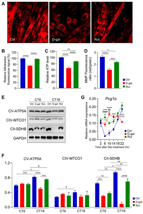 To assess mitochondrial content in differentiated C2C12 myotubes, MitoTracker staining was performed. Consistent with the H&E staining results, the control group exhibited well-differentiated myotubes with multinucleated cells and abundant mitochondrial signals (MitoTracker; red; Figure 4A). In contrast, D-gal treatment resulted in poorly differentiated myotubes with markedly diminished mitochondrial staining (Figure 4A). Rutin treatment (20 μM) significantly enhanced mitochondrial content, restoring it to levels comparable with the control group (Figure 4B). Beyond mitochondrial abundance, ATP production capacity was also evaluated. The D-gal group exhibited approximately a 25% reduction in ATP generation relative to the control group (p < 0.0001; Figure 4C). Rutin supplementation significantly restored ATP production (p < 0.0001 vs. D-gal). Likewise, the mitochondrial membrane potential (MMP), determined by the red/green fluorescence ratio, was markedly reduced in the D-galactose-treated group compared with the control group (p < 0.0001; Figure 4D), indicating mitochondrial dysfunction. Treatment with rutin substantially improved MMP, increasing the red/green ratio to levels comparable to the control group (p < 0.001 vs. D-gal). Regarding oxidative phosphorylation (OXPHOS) proteins, including ATP5A, MTCO1, and SDHB, the control group displayed distinct diurnal variations, which were diminished by D-gal treatment (Figure 4E,F). In D-gal–induced senescent myotubes, the expression levels of these proteins were notably lower at CT18 than at CT6 (Figure 4E,F). Rutin treatment increased OXPHOS protein expression relative to D-gal treatment, with ATP5A and SDHB regaining a rhythmic oscillatory pattern resembling that of the control group (Figure 4E,F). The mRNA expression of Pgc1α, a key regulator of mitochondrial function, exhibited an antiphase pattern in differentiated C2C12 myotubes subjected to D-gal–induced senescence compared with the control group (Figure 4G). Notably, rutin treatment restored the normal oscillatory pattern of Pgc1α expression, indicating its role in rescuing circadian-regulated mitochondrial gene expression in senescent muscle cells. Collectively, these findings indicate that rutin mitigates D-galactose–induced mitochondrial impairment by increasing mitochondrial content, restoring ATP synthesis, enhancing membrane potential, and reestablishing the rhythmic expression of OXPHOS proteins in differentiated C2C12 myotubes.