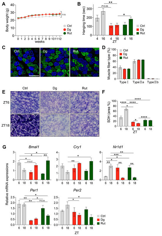Weekly measurements of mouse body weight showed no significant differences among groups (Figure 5A). A hanging test was performed to evaluate muscle functional output (Figure 5B). The control group exhibited diurnal variation in muscle performance, with significantly enhanced output at ZT16, corresponding to the active phase. Compared with the control group, D-gal treatment reduced overall motor performance and blunted diurnal variation in muscle function, whereas rutin administration (100 mg/kg b.w.) enhanced motor capacity and prominently re-established diurnal change at ZT16. In terms of muscle diameter, D-gal group showed a trend of decreased diameter than the control group in soleus. Rutin administration significantly increased muscle diameter compared to the D-gal (Supplementary Figure S1A). Muscle fiber staining was performed to analyze histological alterations in muscle fiber type (Figure 5C,D and Supplementary Figure S1B). No significant differences were observed among fiber types in soleus, plantaris, and gastrocnemius. To assess mitochondrial oxidative capacity in D-gal–induced aging skeletal muscle, SDH staining was conducted (Figure 5E). In the control group, mitochondrial oxidative capacity was elevated at ZT18. Conversely, D-gal treatment revealed an antiphase pattern with a significant reduction (p < 0.001), which was ameliorated by rutin treatment (Figure 5F). Following these findings, real-time PCR was performed to evaluate core clock gene expression, including Bmal1, Per1, Per2, Cry1, and Nr1d1, in calf muscle (Figure 5G). D-gal treatment resulted in an antiphase oscillation pattern of Bmal1, Per1, Per2, and Cry1 compared with the control group. Although the diurnal amplitude of Bmal1 and Cry1 appeared higher after rutin treatment, this represents a restoration of rhythmicity rather than abnormal fluctuation, since D-gal treatment markedly dampened their oscillations. Rutin increased Per1 mRNA levels at ZT6 that were reduced by D-gal treatment by showing a higher diurnal oscillation. In contrast, no significant differences were observed in Nr1d1 expression between D-gal and rutin groups. Together, these results demonstrate that rutin partially restored and stabilized circadian rhythmicity of core clock genes, improved mitochondrial oxidative capacity, and enhanced muscle functional output, thereby counteracting aging-induced muscle dysfunction.