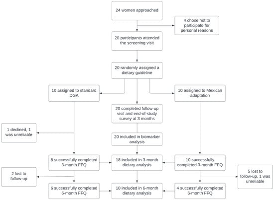 For comparisons of the effects of each arm on biomarkers and diet, generalized estimating equations (GEEs) were computed, and p values of ≤0.05 were considered statistically significant. GEE was adjusted for age and BMI. Analyses were conducted using R statistical software version 4.0.2 (R Foundation for Statistical Computing, Vienna, Austria). Primary analysis was used to examine changes after 3 months, and secondary analysis was applied to investigate changes after 6 months. The intervention effects of the standard DGA vs. Mexican adaptation recommendations on biomarkers and diet were evaluated by contrasting the measures at baseline and after 3 and 6 months, unadjusted and adjusted for age and BMI.