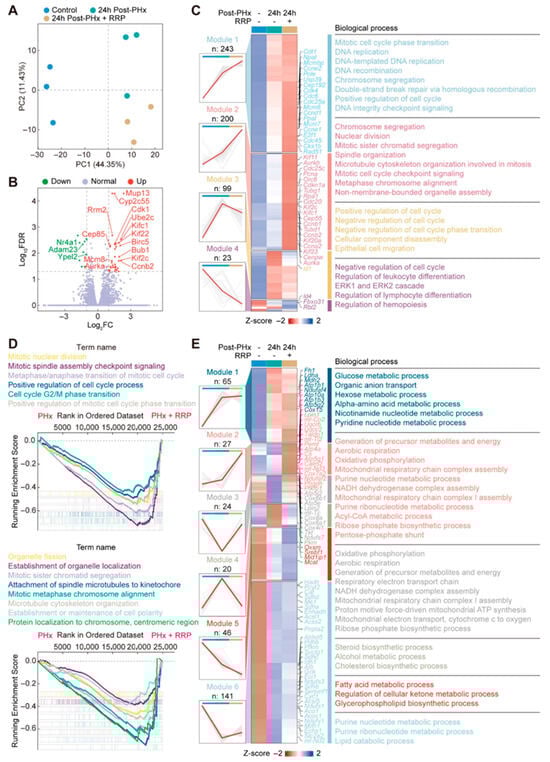 RRP promotes cell cycle progression and induces transcriptional metabolic reprogramming during early liver regeneration. (A) Principal component analysis of transcriptomic profiles. (B) Volcano plot of differentially expressed genes. (C) Cluster heatmap of genes enriched in cell division-related GO terms. (D) GSEA analysis plot showing enrichment of cell cycle-related gene sets. (E) Cluster heatmap of genes involved in cellular metabolic processes.
