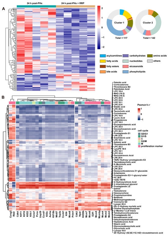 RRP remodels lipid metabolism and links lipid-derived metabolites to hepatocyte cell cycle activation. (A) Metabolite heatmap with abundance clustering and compound classification. (B) Heatmap of correlations between metabolites and cell cycle genes.