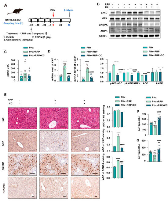 AMPK inhibition impairs RRP-induced metabolic remodeling and hepatocyte proliferation post-PHx. (A) Experimental timeline showing PHx, RRP administration (5 mg/kg), and Compound C (20 mg/kg) intervention. (B) Western blot analysis of pACC, ACC, pAMPK, and AMPK protein levels. (C) Hepatic acetyl-CoA levels. (D) Relative mRNA expression of Ccnd1 and Ki67 in liver from each group was determined by qPCR and normalized using Hprt1 as an internal control. (E) H&E and immunohistochemical staining for KI67, CCND1, and H3K27ac, with AOD quantitative analysis. (F,G) Serum levels of ALT and AST. Scale bar = 100 μm. Statistical significance: * p < 0.05, ** p < 0.01, *** p < 0.001, **** p < 0.0001 as compared with the PHx group; # p < 0.05, ### p < 0.001, #### p < 0.0001 as compared with the PHx + RRP group (n = 6 for mice).