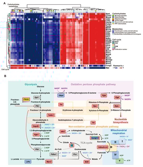 RRP coordinates carbohydrate metabolism with cell cycle progression to support liver regeneration. (A) Correlation heatmap of carbohydrate metabolites and cell cycle genes. (B) Schematic map of metabolic pathways with highlighted upregulated genes.