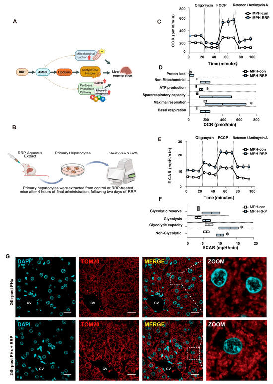 Since the lipid and glucose metabolic processes described above depended on mitochondrial functional integrity, we finally examined how RRP affected mitochondrial function itself during early liver regeneration. Figure 8A illustrates the overall mechanism of RRP treatment and its effects on liver regeneration through mitochondrial and metabolic pathways. To capture the in vivo effects, mice were pretreated with RRP by oral gavage once daily for two consecutive days. Four hours after the final administration, primary hepatocytes were isolated from control and RRP-treated mice for immediate metabolic analysis using the Seahorse XFe24 extracellular flux analyzer (Figure 8B). Oxygen consumption rate (OCR) measurements revealed that hepatocytes from RRP-treated mice showed significantly increased ATP production and maximal respiratory capacity, indicating enhanced mitochondrial oxidative phosphorylation. Other OCR parameters, such as proton leak, basal respiration, non-mitochondrial respiration, and spare respiratory capacity, remained unchanged, suggesting that mitochondrial integrity was preserved (Figure 8C,D). Concurrently, extracellular acidification rate (ECAR) analysis demonstrated elevated basal and compensatory glycolysis, reflecting increased glycolytic capacity (Figure 8E,F). Immunofluorescence staining for TOM20, a key component of the mitochondrial outer membrane translocase complex responsible for importing nuclear-encoded proteins, showed increased expression and more distinct mitochondrial morphology in RRP-treated mouse livers (Figure 8G). These results indicated that RRP treatment improved mitochondrial biogenesis and metabolic efficiency in hepatocytes to support the energy demands of liver regeneration.