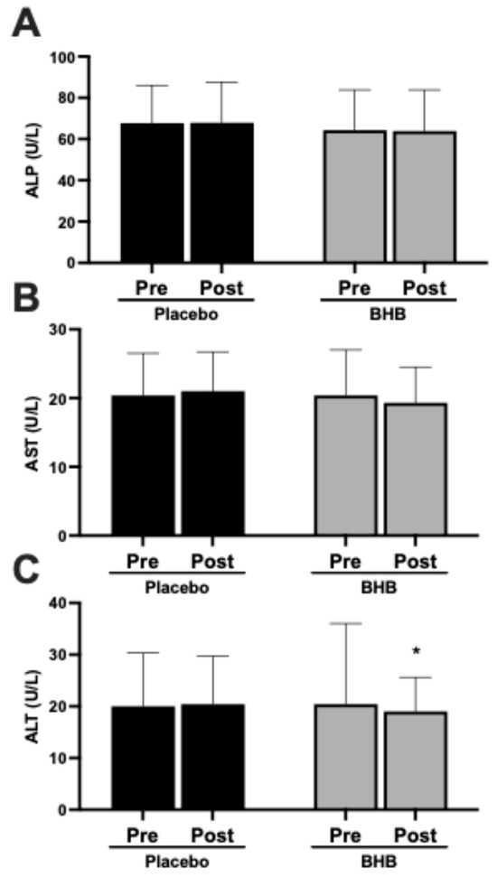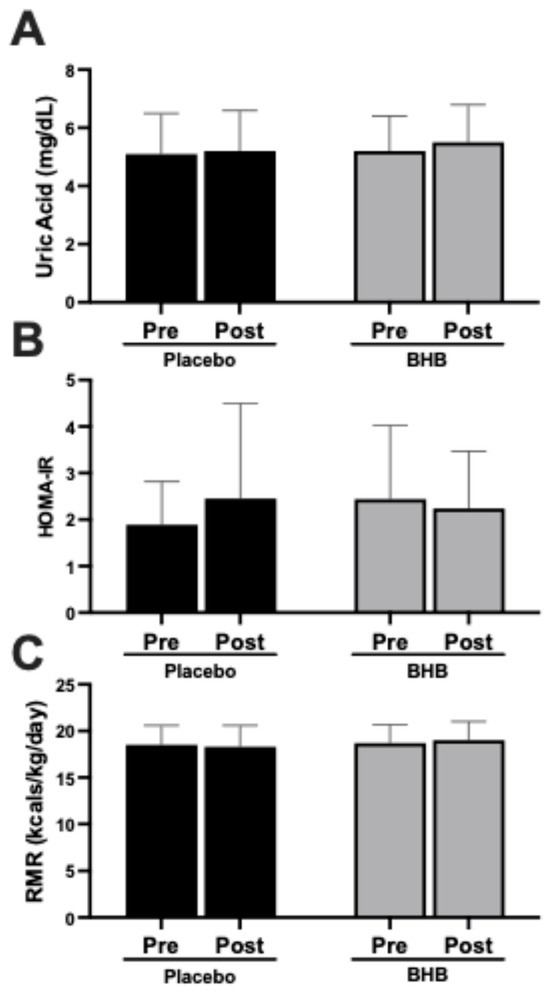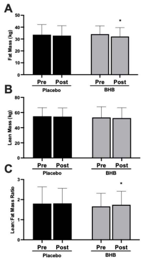 | BHB | 24 | 119.3 ± 33.9 | 110.5 ± 34.1 | −8.79 ± 19.3 | 0.04 | |