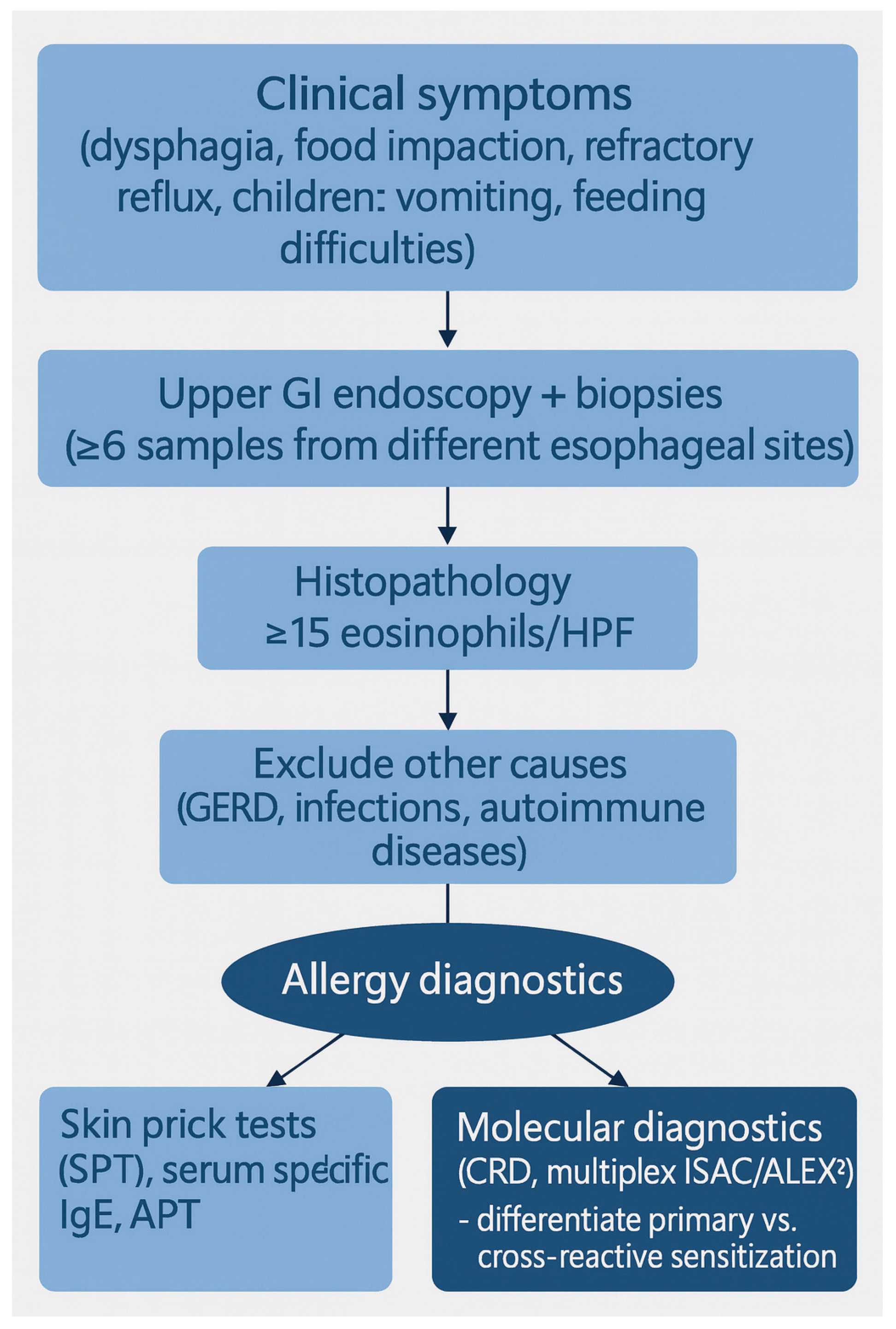 - Anyane-Yeboa, A.; Wang, W.; Kavitt, R.T. The Role of Allergy Testing in Eosinophilic Esophagitis. Gastroenterol. Hepatol. 2018, 14, 463–469. [Google Scholar] [PubMed] [PubMed Central]