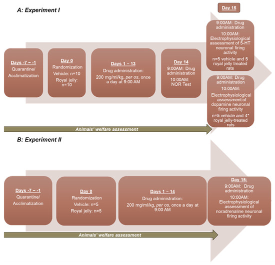 After a seven-day quarantine period, designated to exclude the presence of pathogens and to allow the animals to acclimatize to the animal facility, the animals were randomly divided into two groups: royal jelly and vehicle (TBS). The number of animals per group (n = 10/group in the novel object recognition: NOR experiments with the subsequent assessment of firing activity of 5-HT and dopaminergic neurons and n = 5/group for the assessment of the firing activity of noradrenergic neurons) was determined by power analysis based on the results of our previous studies [20,21,22]. The royal jelly TBS solution was administered per os, at a dose of 200 mg/mL/kg, for fifteen consecutive days, once daily at 9 a.m.; control animals were administered vehicle. The dose and the route of administration were set in accordance with a previous study [16].