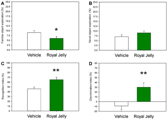 Effect of the chronic treatment with royal jelly on familiar (A) and novel (B) object exploration and on recognition (C) and discrimination (D) indexes in the NOR test; * p < 0.05 and ** p < 0.01 in comparison with vehicle, two-tailed Student’s t-test (n = 10 rats in each group).