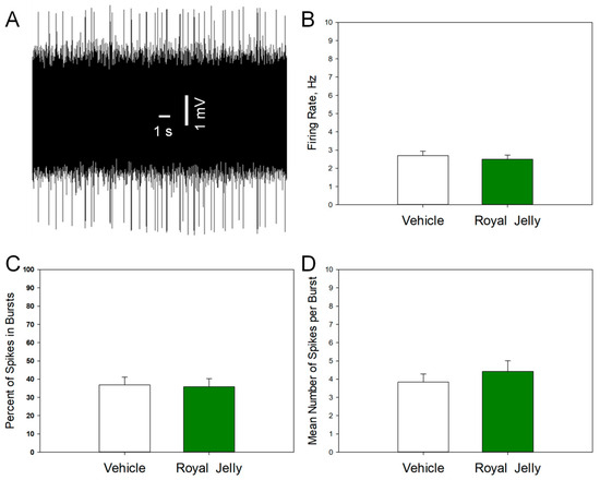 Characteristics of the excitability of 5-HT neurons of the DRN in the vehicle (n = 48 neurons from 5 rats)- and royal jelly (n = 48 neurons from 5 rats)-treated rats; (A): representative recording from a DRN 5-HT neuron; (B): mean spontaneous firing rate; (C): percent of spikes in bursts; (D): mean number of spikes in burst.