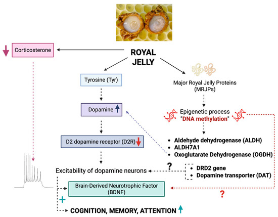 Alternatively, MRJP(s), as epigenetic modulators [9], might modulate expression of the genes coding for proteins regulating dopamine transmission, such as D2 autoreceptor, dopamine transporter (DAT), and/or enzymes involved in dopamine synthesis and metabolism, such as tyrosine hydroxylase. There is some evidence that royal jelly may lead to methylation of the genes ALDH, ALDH7A1, and OGDH, playing an important role in tyrosine metabolism and dopaminergic signaling in honeybees [33].