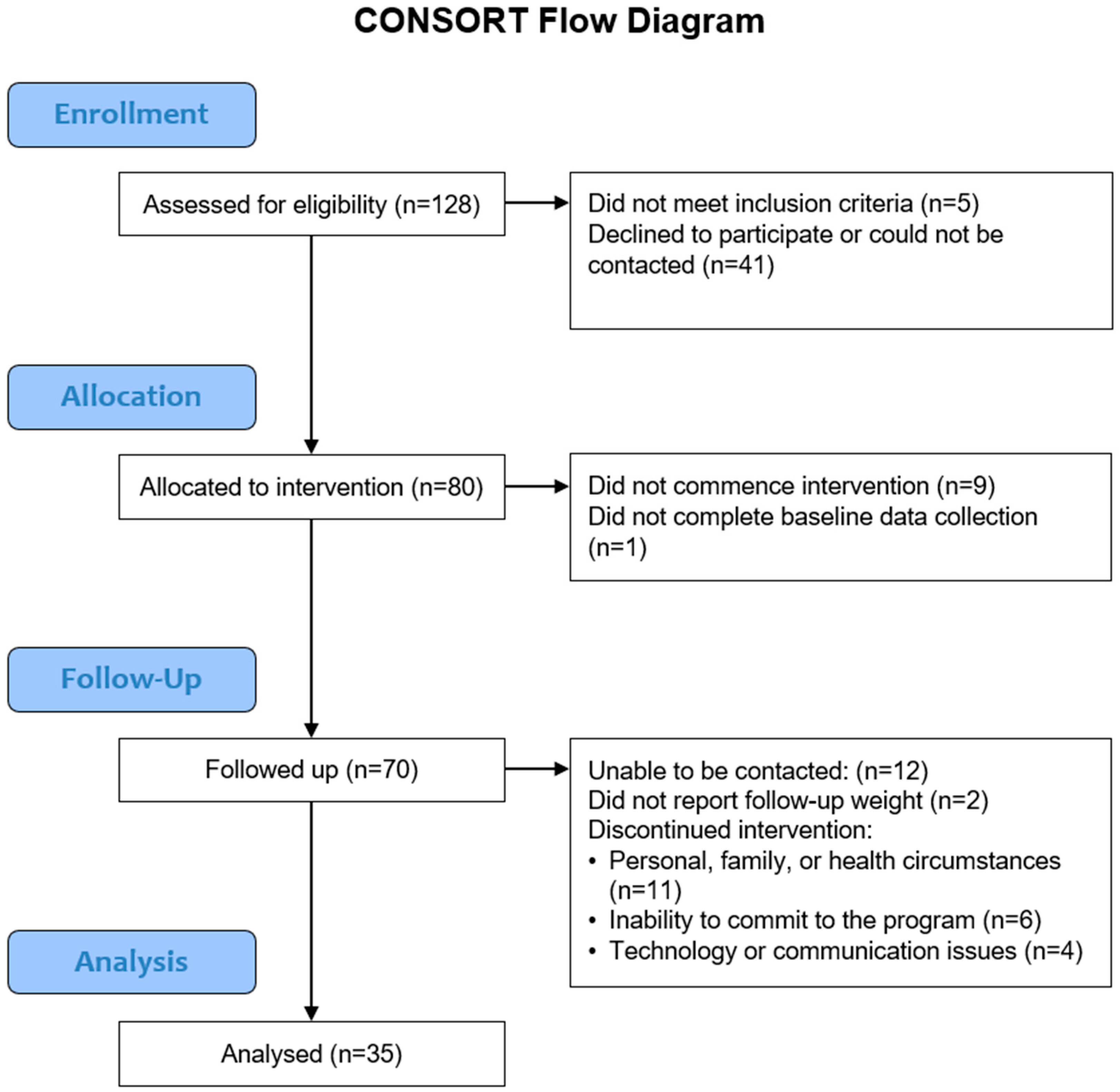 | Weight, achievement, or steps (yes n = 29) | −4.1 (4.1) | −1.7 (2.4) | −2.5 (−5.1, 0.2) | 0.164 |