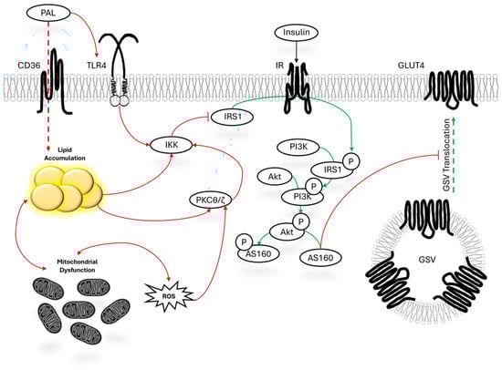 Mechanistic overview of palmitate-induced insulin resistance. Notes: Solid black arrows denote signaling and activation. Arrows that travel behind a molecular target indicate that the molecular target over the arrow phosphorylates the target from which arrow originates. Green arrows indicate normal insulin signaling mechanisms. Red arrows indicate the contribution of this pathway negatively impacts insulin signaling. Dashed arrows indicate the uptake of palmitate or translocation of GLUT4 vesicles. Abbreviations: GLUT4, glucose transporter member 4; GSV, GLUT4 storage vesicles; Iκκ, I kappa B kinase; IRS1, insulin receptor substrate 1; IR, insulin receptor; PI3K, phosphatidylinositol 3-kinase; PKC, protein kinase c; ROS, reactive oxygen species; TLR4, toll-like receptor 4.