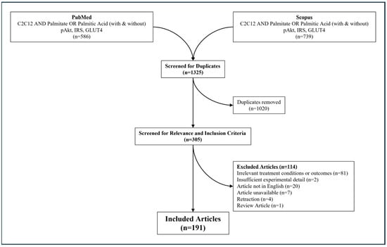 An initial historical search identified an article published as early as 1999 which first assessed the effect of palmitate conjugated with BSA on insulin signaling in C2C12 cells []. Initial search results from both PubMed and Scopus identified 1325 search results. After removing duplicate articles from overlapping search results, a total of 310 articles were identified and twice-screened (initially by RAV and secondarily by a separate independent author for verification of inclusion criteria and generation of estimated effect). After further removal of articles without relevant experimental conditions and/or outcomes, unavailable texts, review articles, articles not in English, and retractions, a total of 191 articles were included (Figure 2). Further details regarding article inclusion/exclusion results (Supplementary Table S1) and raw data estimates (Supplementary File S1) are provided within the Supplemental Materials.