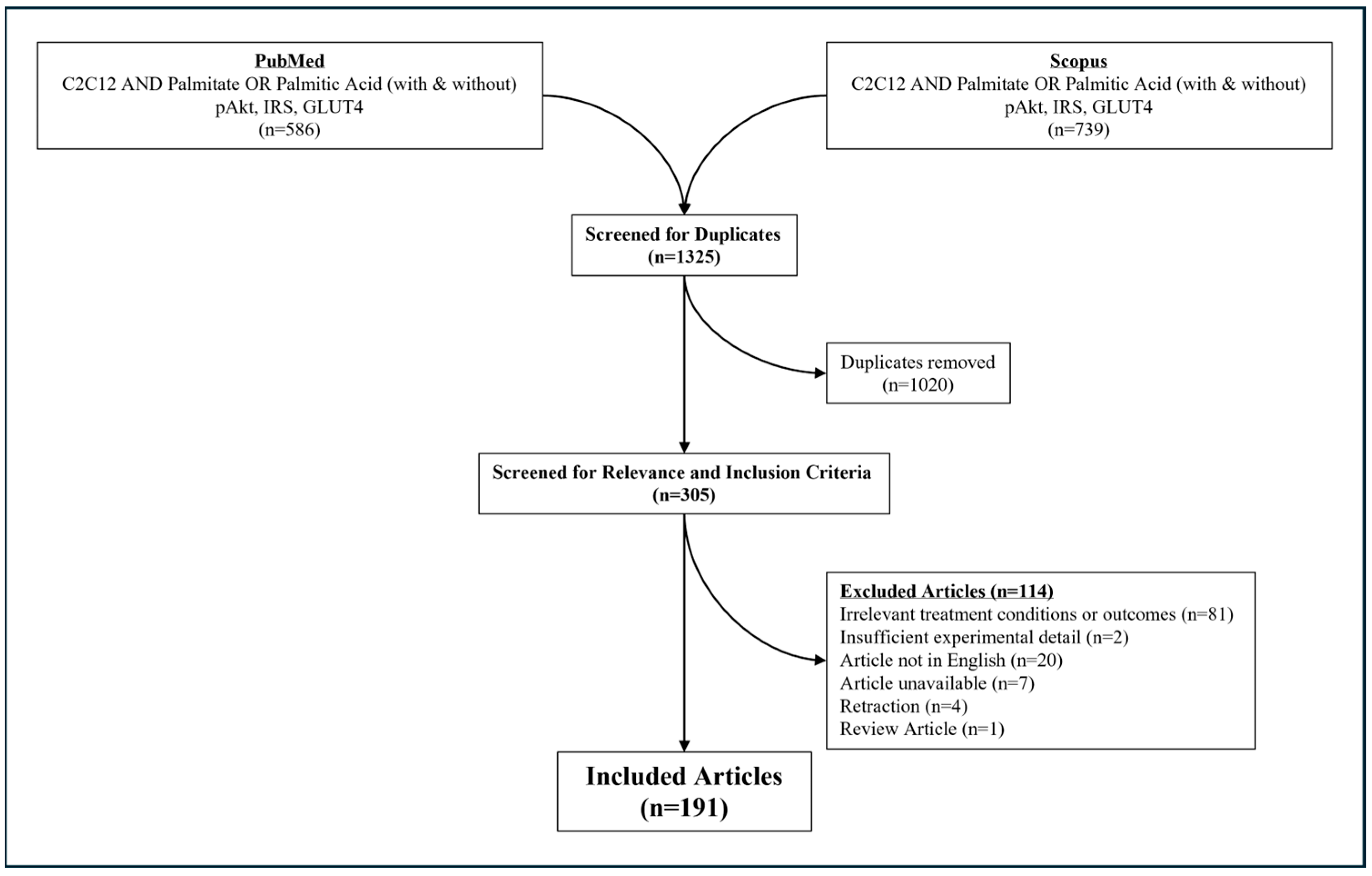 APA StyleZimmerman, J. M., Klein, A. J., Travis, K. B., & Vaughan, R. A. (2025). A Systematic Review of Palmitate-Mediated Insulin Resistance in C2C12 Myotubes. Nutrients, 17(22), 3619. https://doi.org/10.3390/nu17223619