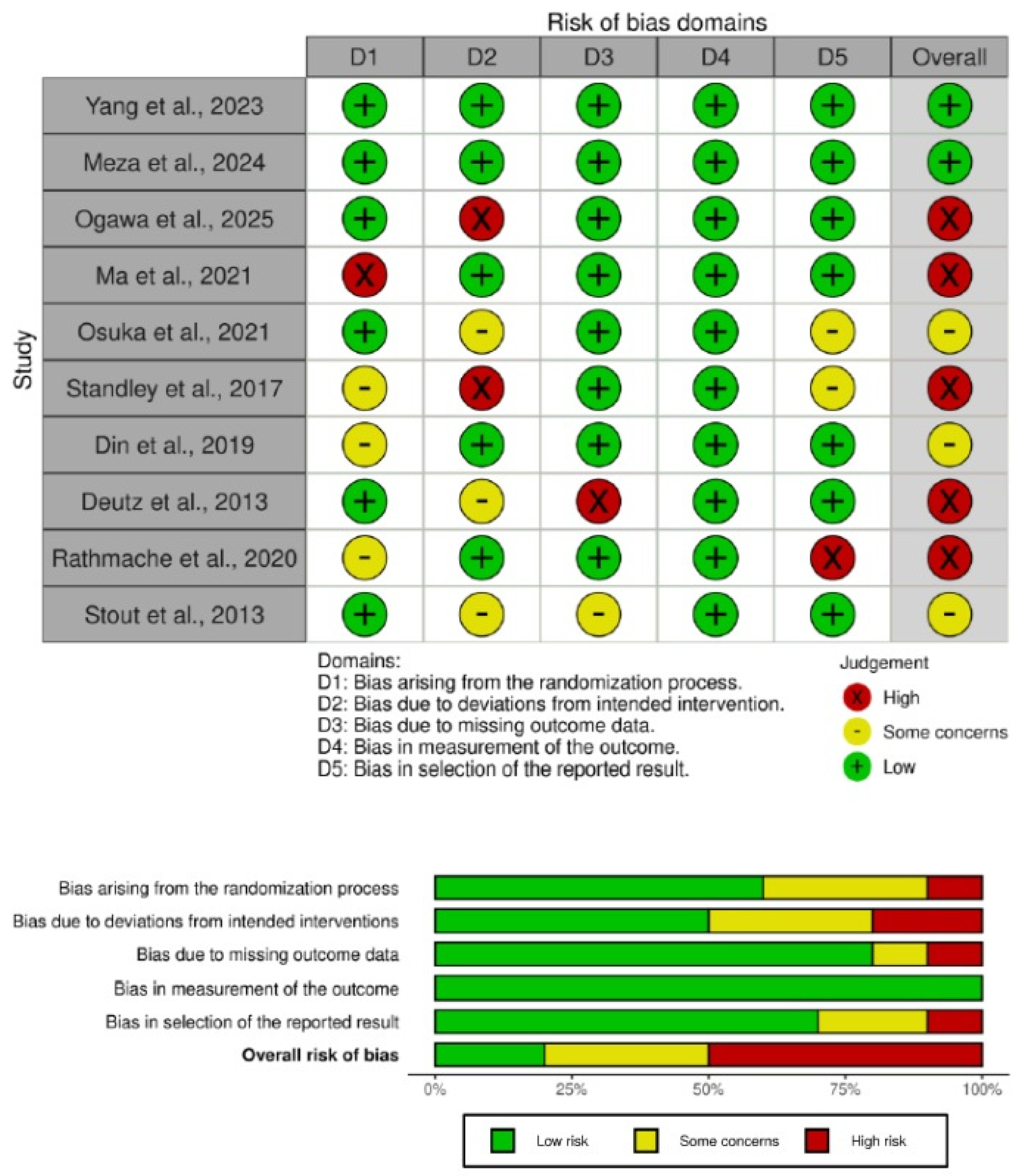 - Sterne, J.A.C.; Savović, J.; Page, M.J.; Elbers, R.G.; Blencowe, N.S.; Boutron, I.; Cates, C.J.; Cheng, H.Y.; Corbett, M.S.; Eldridge, S.M.; et al. RoB 2: A Revised Tool for Assessing Risk of Bias in Randomised Trials. BMJ 2019, 366, l4898. [Google Scholar] [CrossRef]