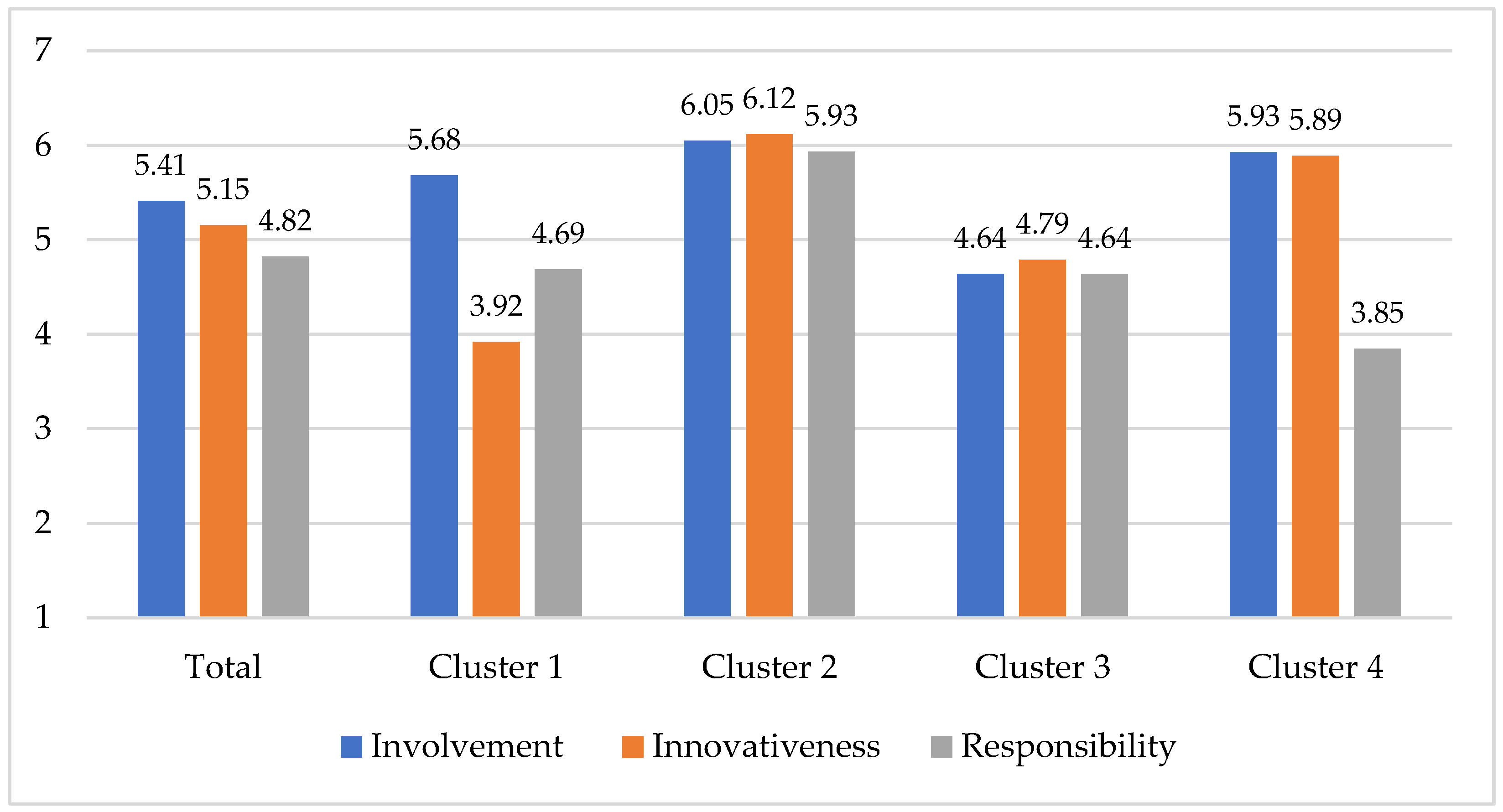 | Item Description | Total | Cluster 1 | Cluster 2 | Cluster 3 | Cluster 4 | F-Value (3, 1196) |